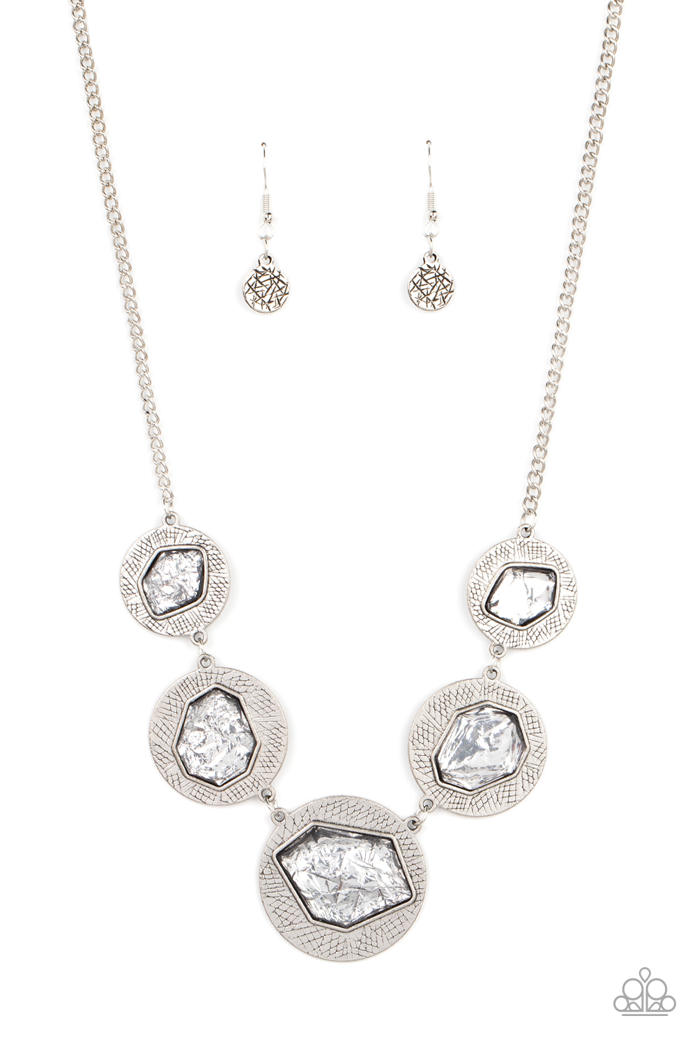 Featuring a refracted shimmer, asymmetrical, glassy silver gems sparkle atop textured silver discs as they delicately link into an edgy statement piece below the collar. Features an adjustable clasp closure.
