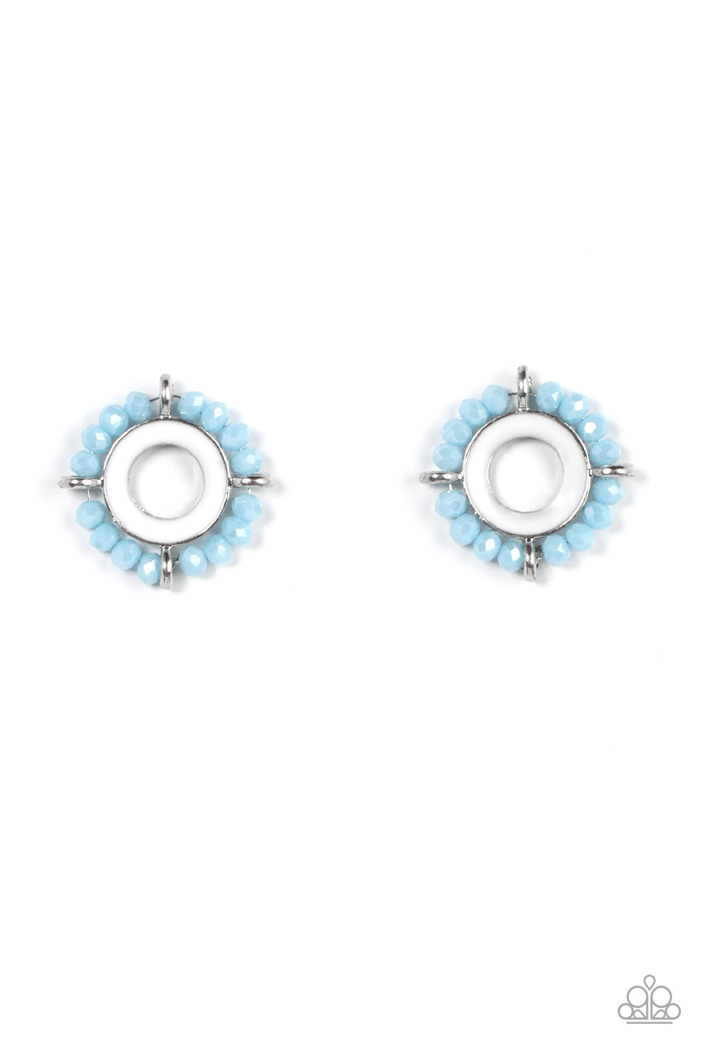 Featuring dainty silver accents, a ring of blue crystal-like beads encircles a silver ring painted in a shiny white finish for a nautical inspired look. Earring attaches to a standard post fitting.