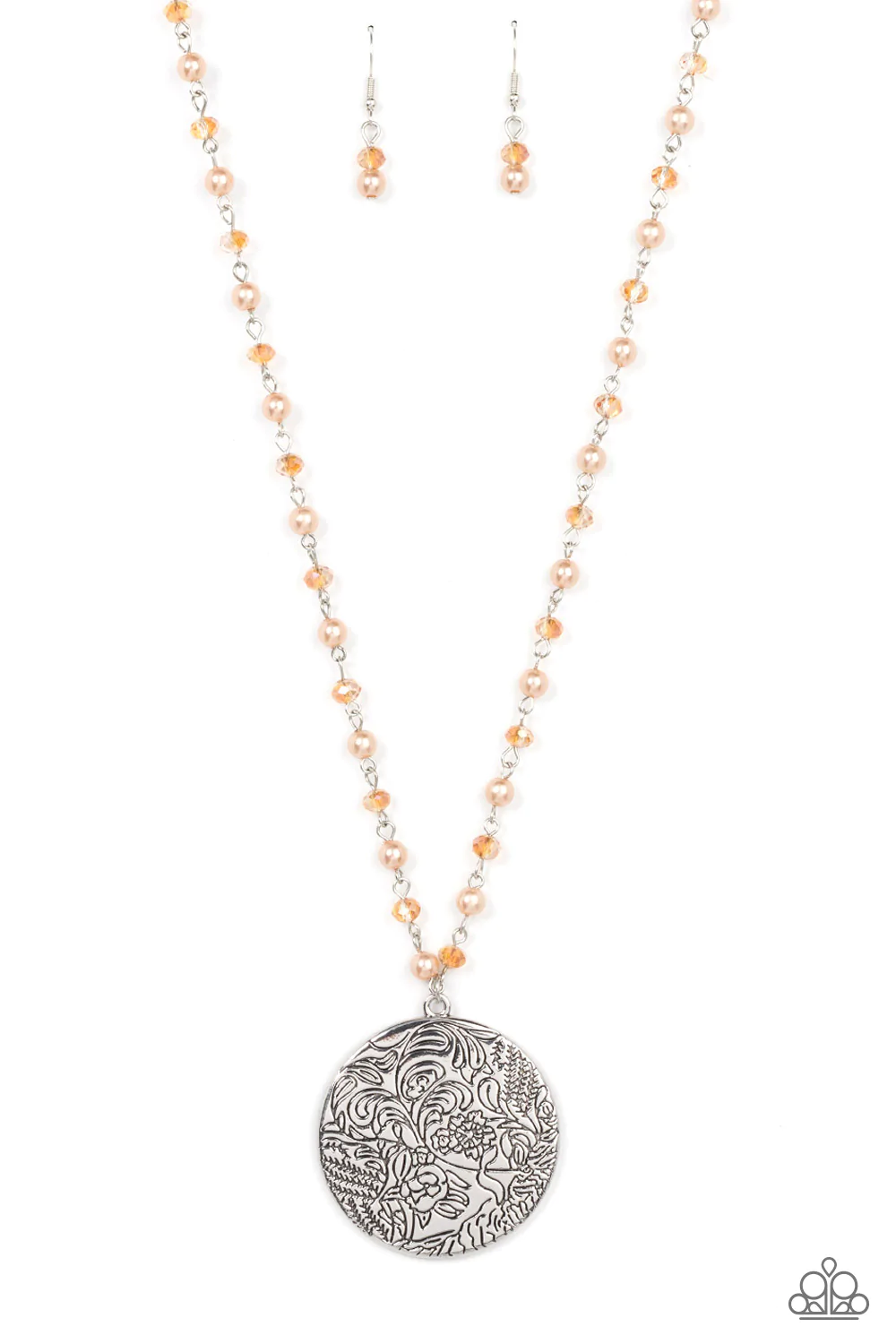 An oversized silver disc stamped in a whimsical floral motif swings from the bottom of a pearly and crystal-like brown beaded chain, resulting in a romantic cottagecore inspired pendant. Features an adjustable clasp closure.