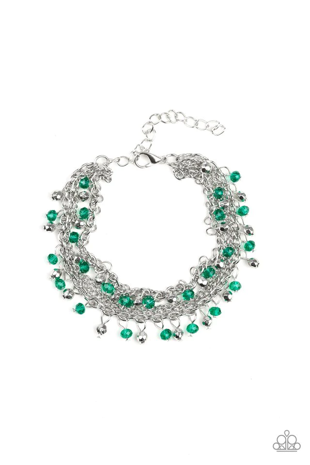 Dainty silver and green crystal-like beads cascade from two shimmery silver chains. Infused with plain silver chains, the colorful strands layer around the wrist for a flirtatious look. Features an adjustable clasp closure. Sold as one individual bracelet.