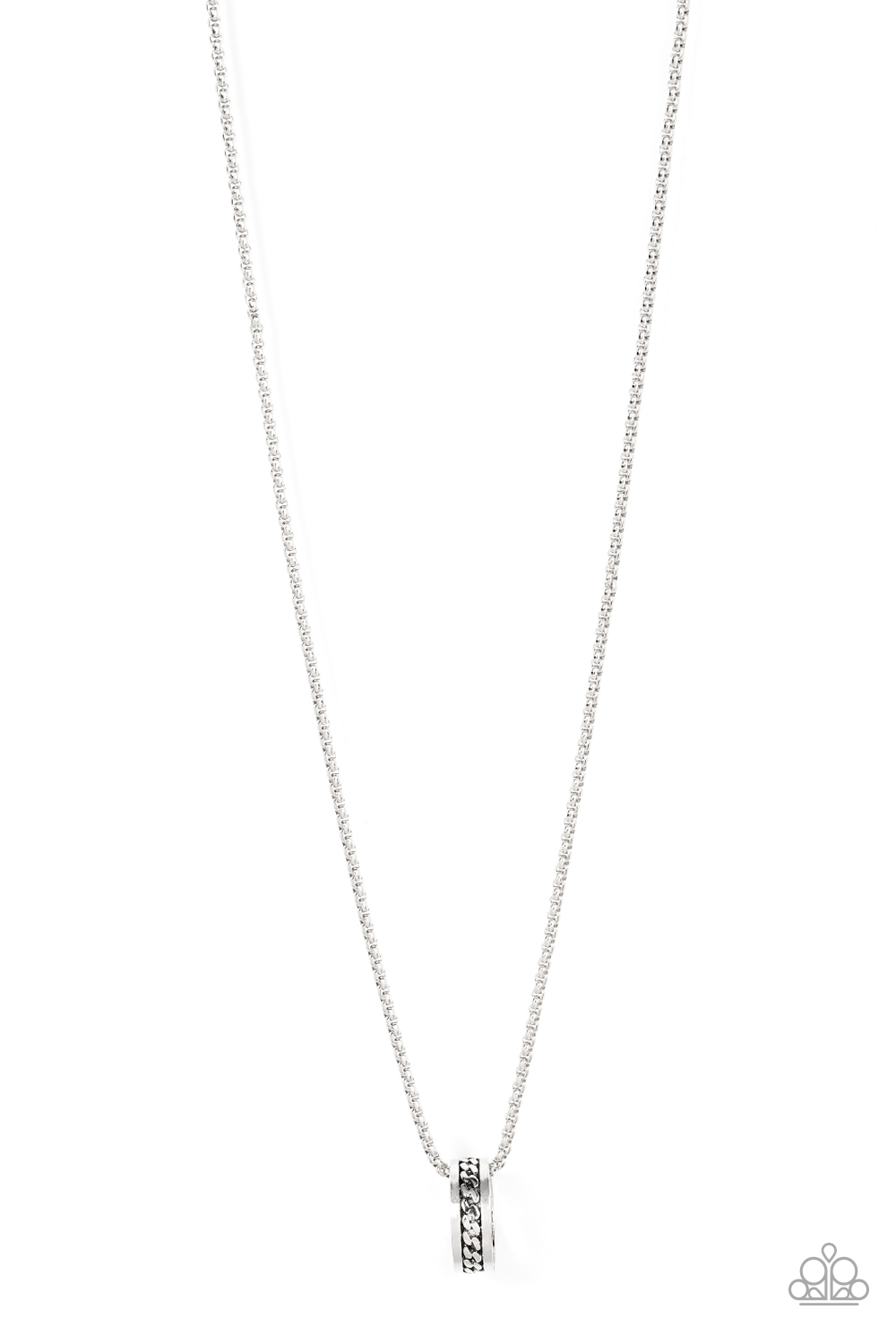 Embossed in a band of zigzagging texture, an antiqued silver ring glides along a strand of silver box chain across the chest in a rustic fashion. Features an adjustable clasp closure.