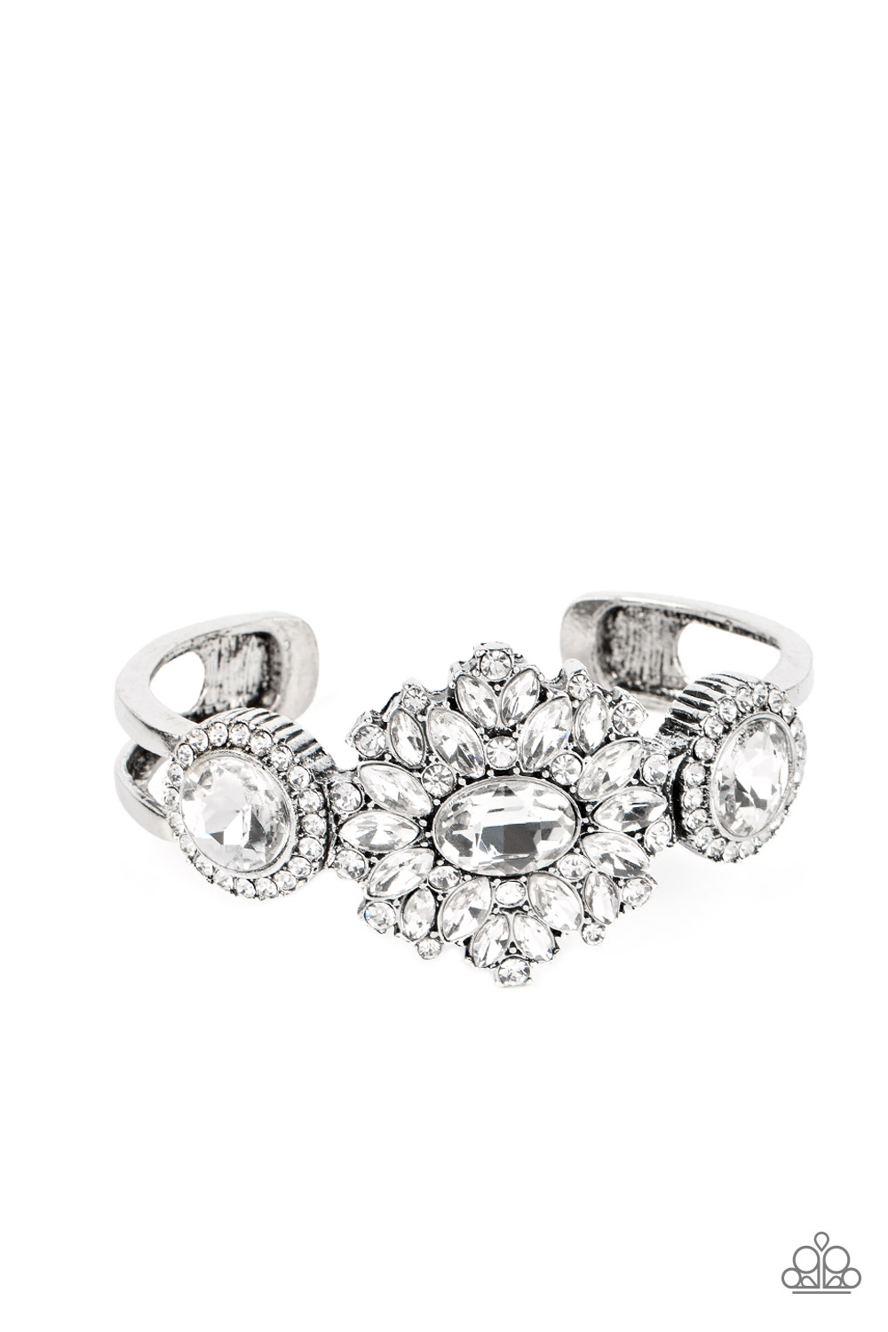 A decadent explosion of dainty white rhinestones and teardrop gems frame a reflective oval gem at their center. On either side of the shimmery centerpiece dainty white rhinestones encircle reflective white gems that are pressed into thick silver frames. The trio of sparkling gems floats on airy silver cuffs that loop around the wrist in a dazzling finish.