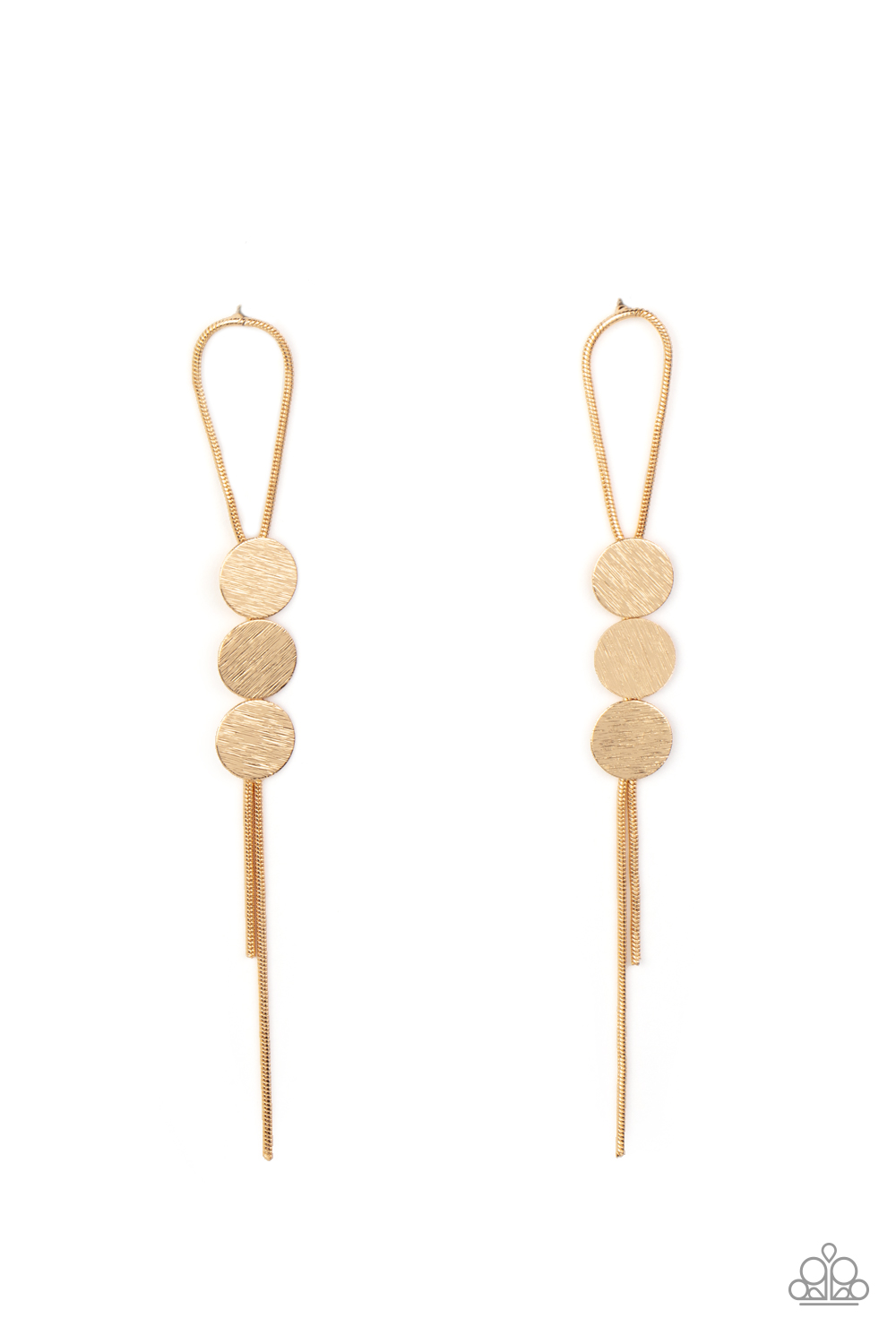A gold loop of round snake chain is held in place by a trio of scratched gold discs, creating a trendy bolo-like lure. Earring attaches to a standard post fitting.