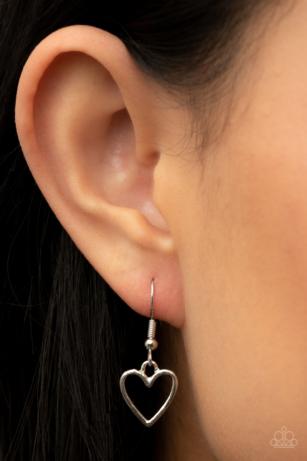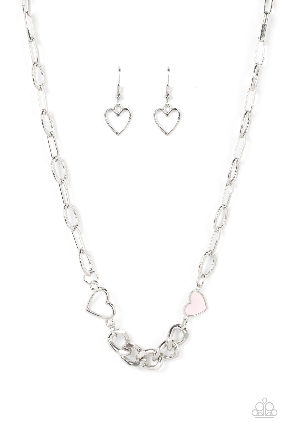 A pair of shiny silver and Pale Rosette hearts asymmetrically adorn sections of mismatched silver chain, resulting in a flirtatious pop of color below the collar. Features an adjustable clasp closure.