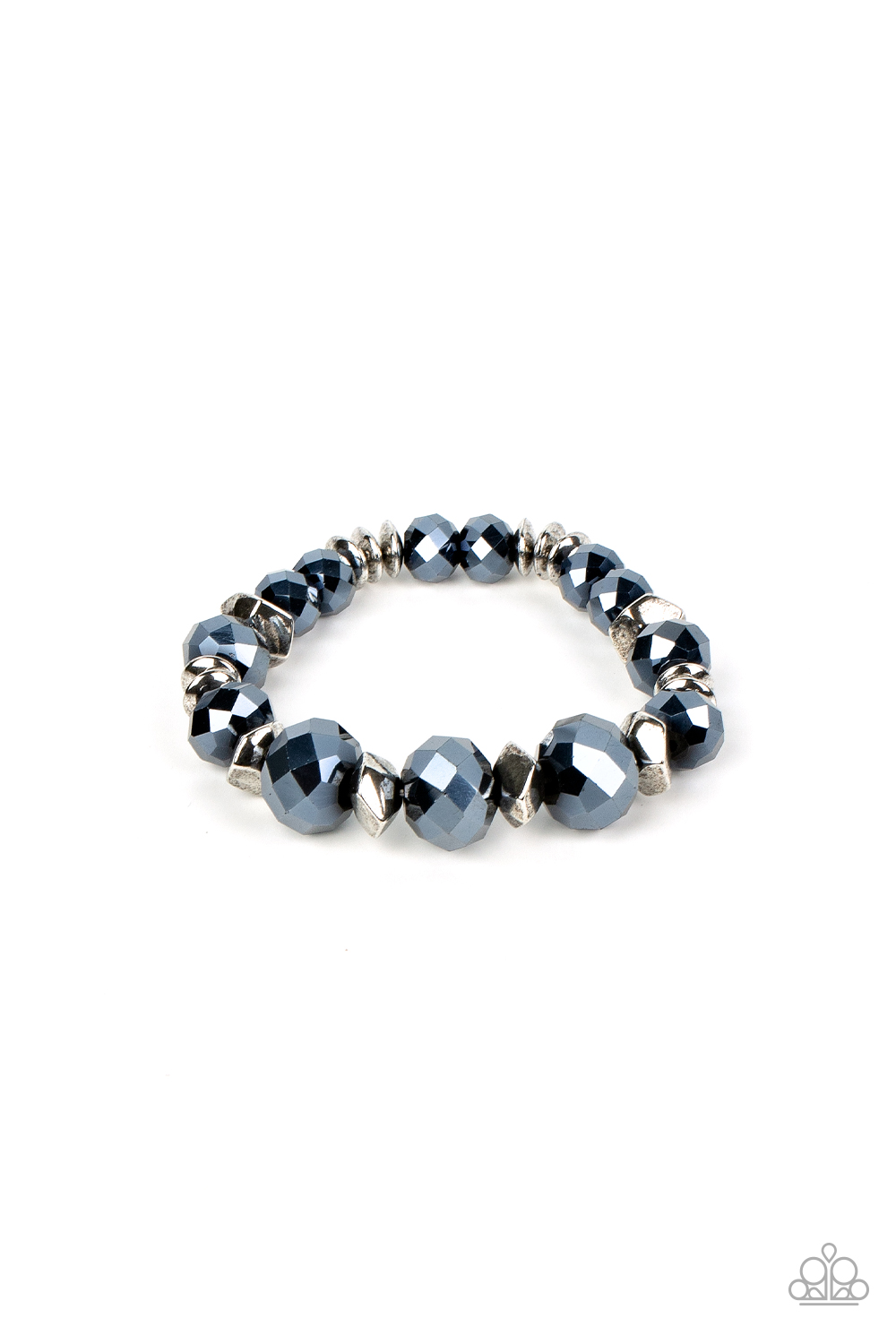 Separated by silver discs and faceted silver accents, faceted blue crystal-like gems are threaded along stretchy bands around the wrist for a stellar statement.