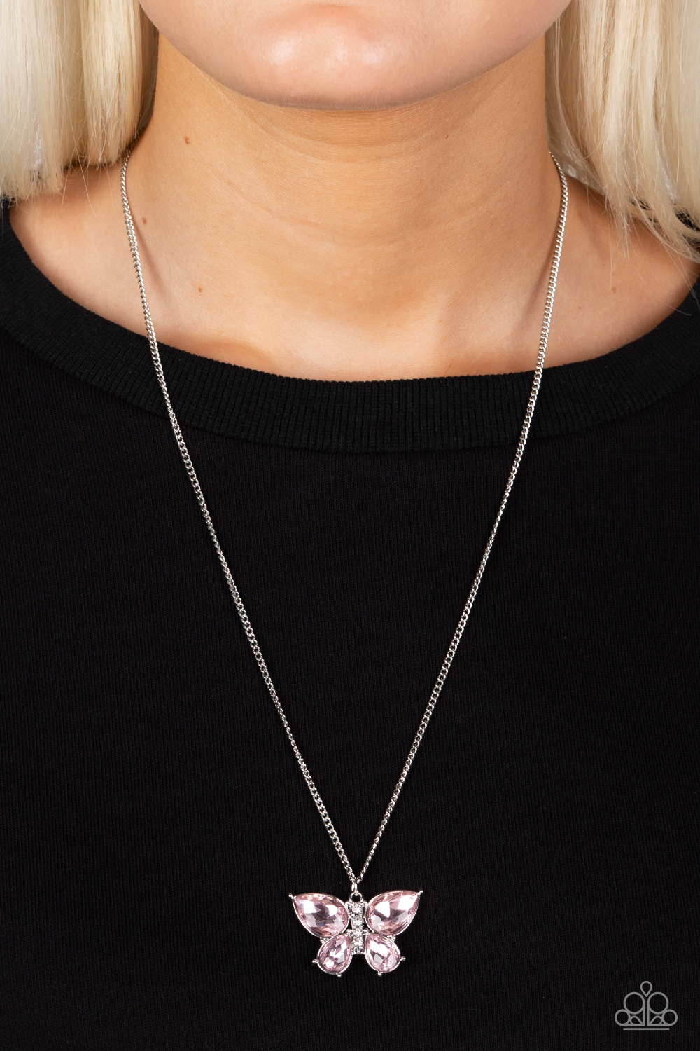 A silver butterfly with pink teardrop rhinestone wings and a white-rhinestone body delicately flutters at the bottom of a silver chain. Features an adjustable clasp closure.