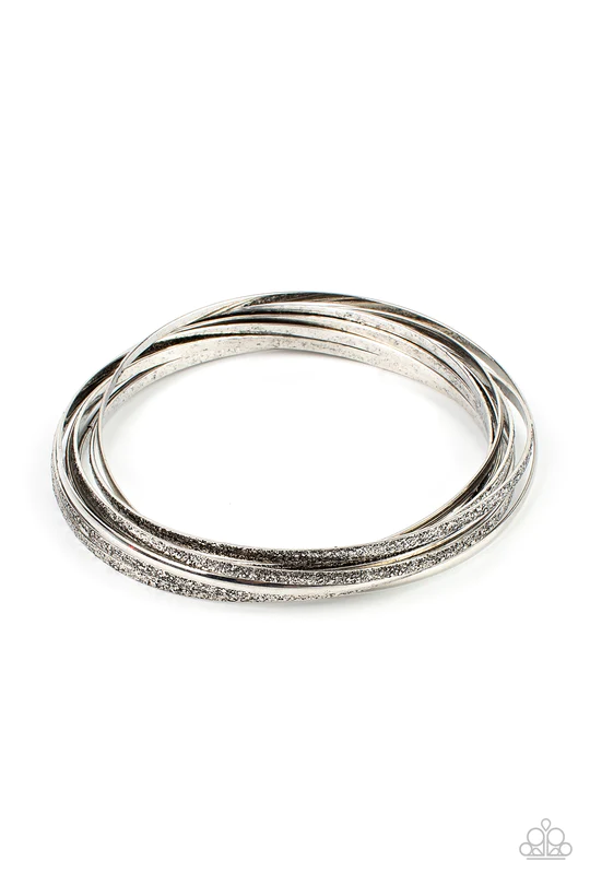 Rustic textured silver and shiny bangles create a tinkling musical chime as they link together rhythmically around the wrist.
