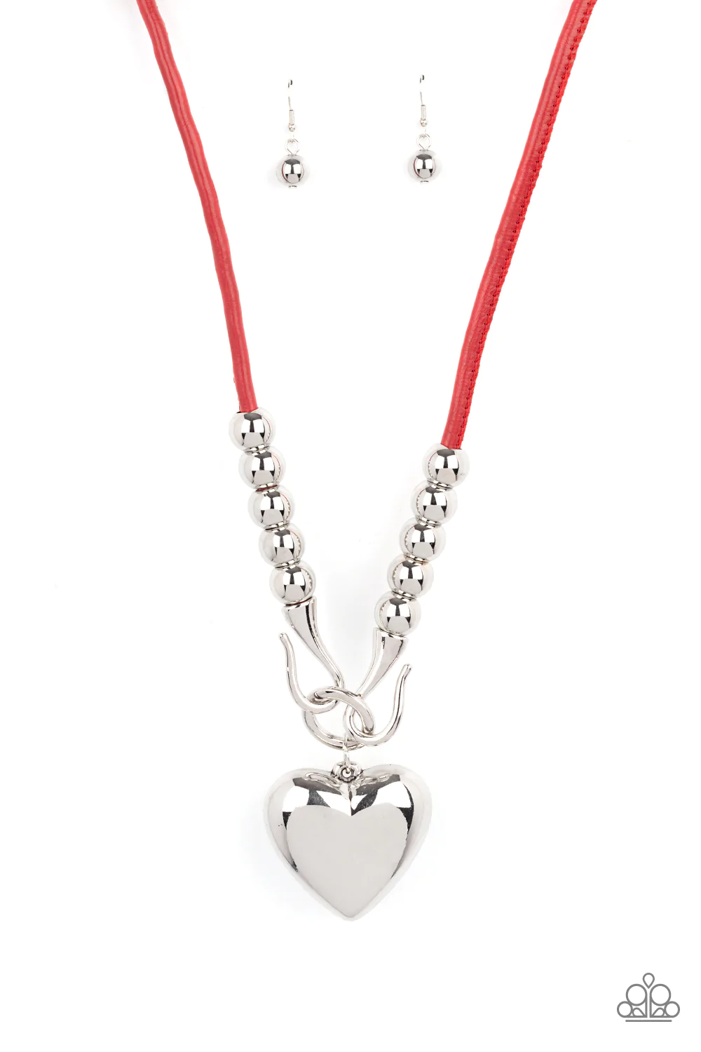 Featuring chunky silver beads, an oversized silver heart pendant swings from dramatic silver hook-like fittings that attach to a bold red leather cord draped across the chest for a haute heartbreaker look. Features an adjustable clasp closure.
