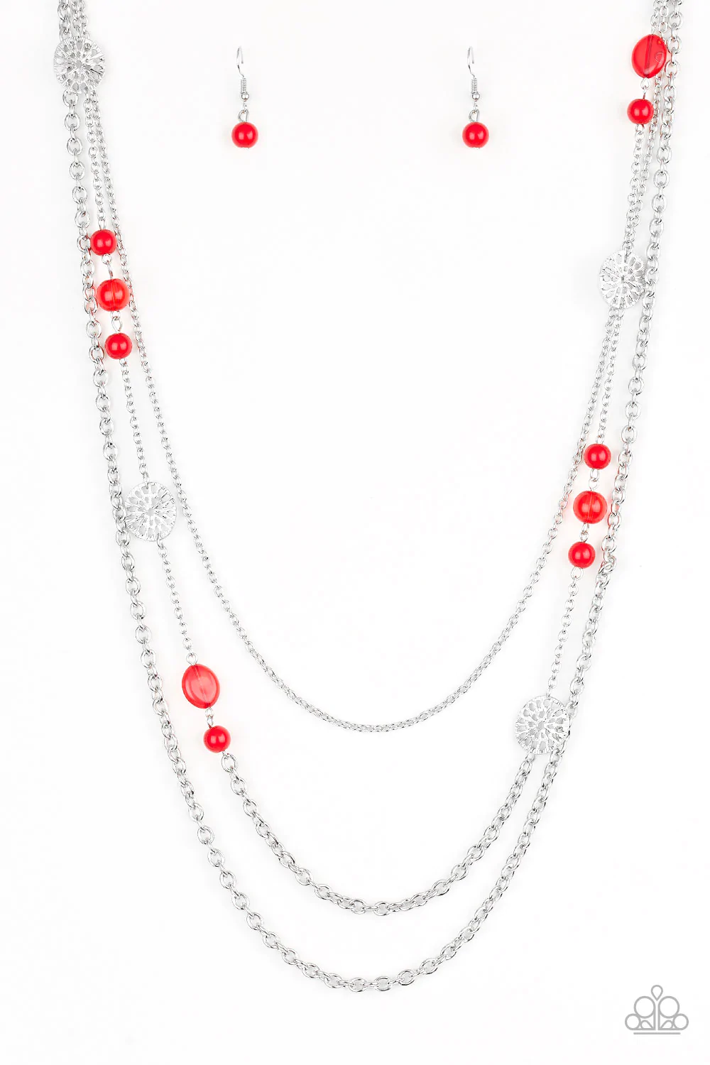 Ornate silver accents, glassy beads, and polished red beads trickle along strands of shimmery silver chains for a whimsical look. Features an adjustable clasp closure.