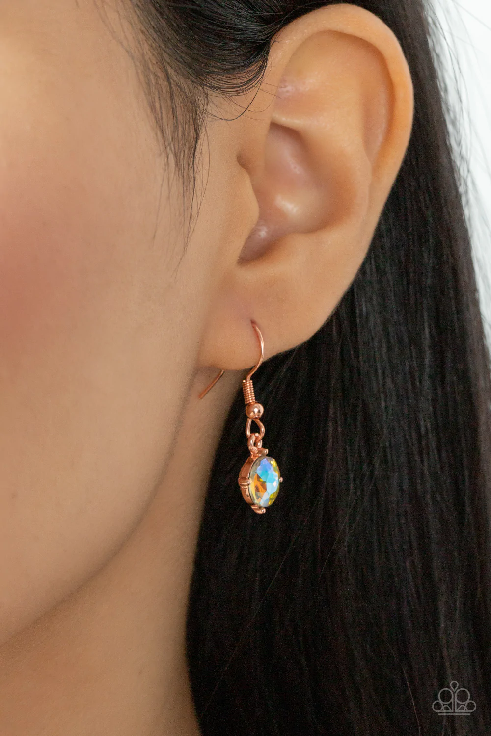 A glittering collection of marquise and round peach-colored gems encased in studded copper fittings, coalesce into a lavish frame that gives way to a classic shiny copper chain resulting in a glamorous finish below the collar. Features an adjustable clasp closure.