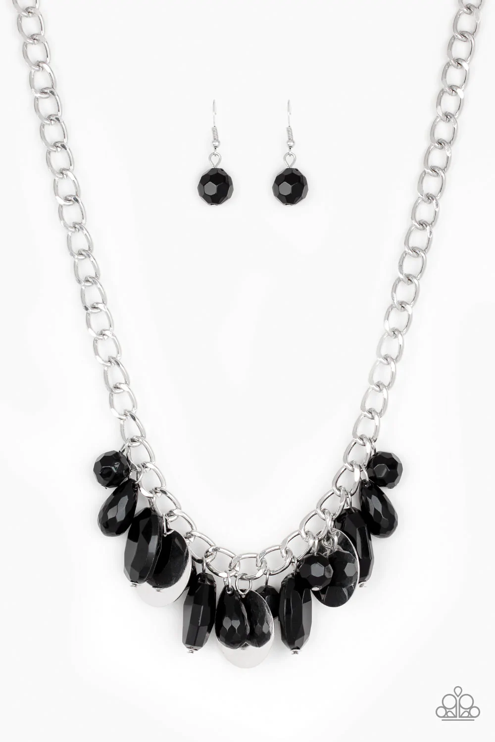 A collection of glassy black beads swings playfully from the bottom of a dramatic silver chain. Glistening silver discs trickle between the colorful beads, creating a refreshing fringe below the collar with shimmering reflections of light. Features an adjustable clasp closure.