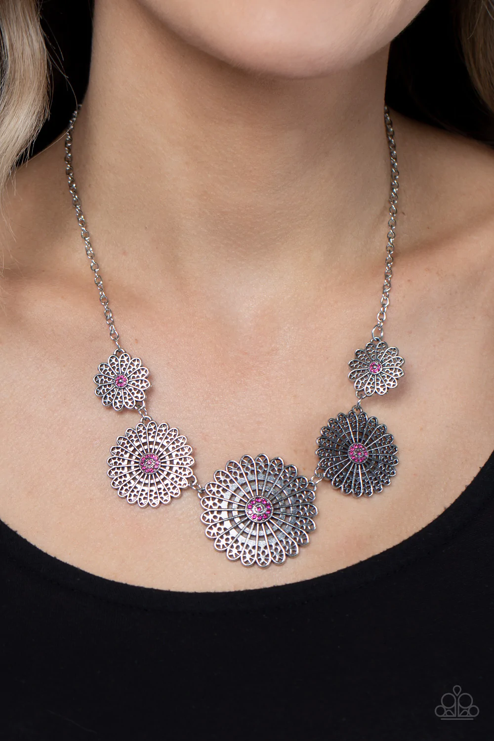 Infused with a whimsical mandala-like motif, tactile silver petals bloom from pink rhinestone dotted centers below the collar. The mismatched silver flowers gradually increase in size, exaggerating the eye-catching details. Features an adjustable clasp closure.