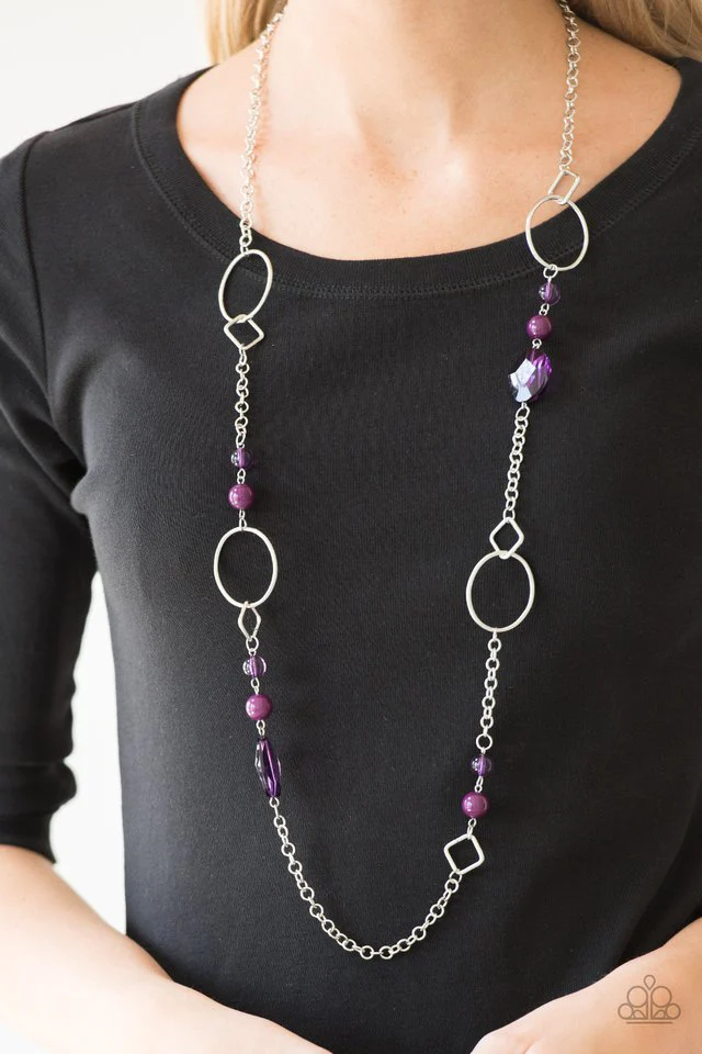 Polished and glassy purple beads trickle along a shimmery silver chain featuring round and square frames for a seasonal look. Features an adjustable clasp closure. Sold as one individual necklace. Includes one pair of matching earrings.