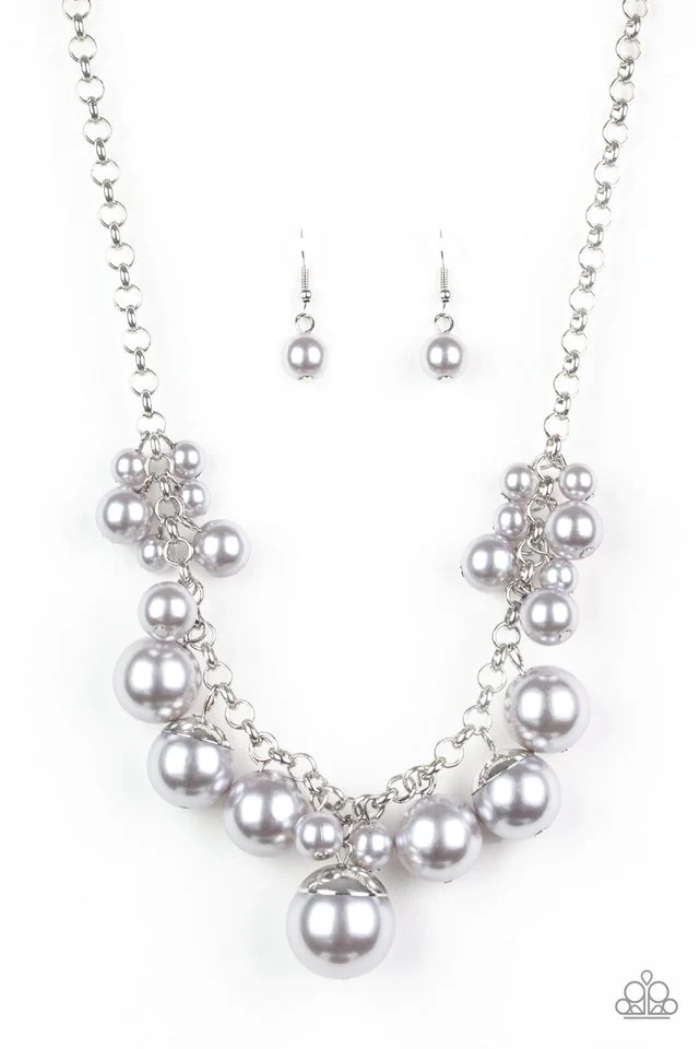Capped in shiny silver fittings, oversized pearly gray beads and a collection of classic gray pearls swing from the bottom of a shimmery silver chain, creating a bubbly fringe below the collar. Features an adjustable clasp closure. Sold as one individual necklace. Includes one pair of matching earrings.