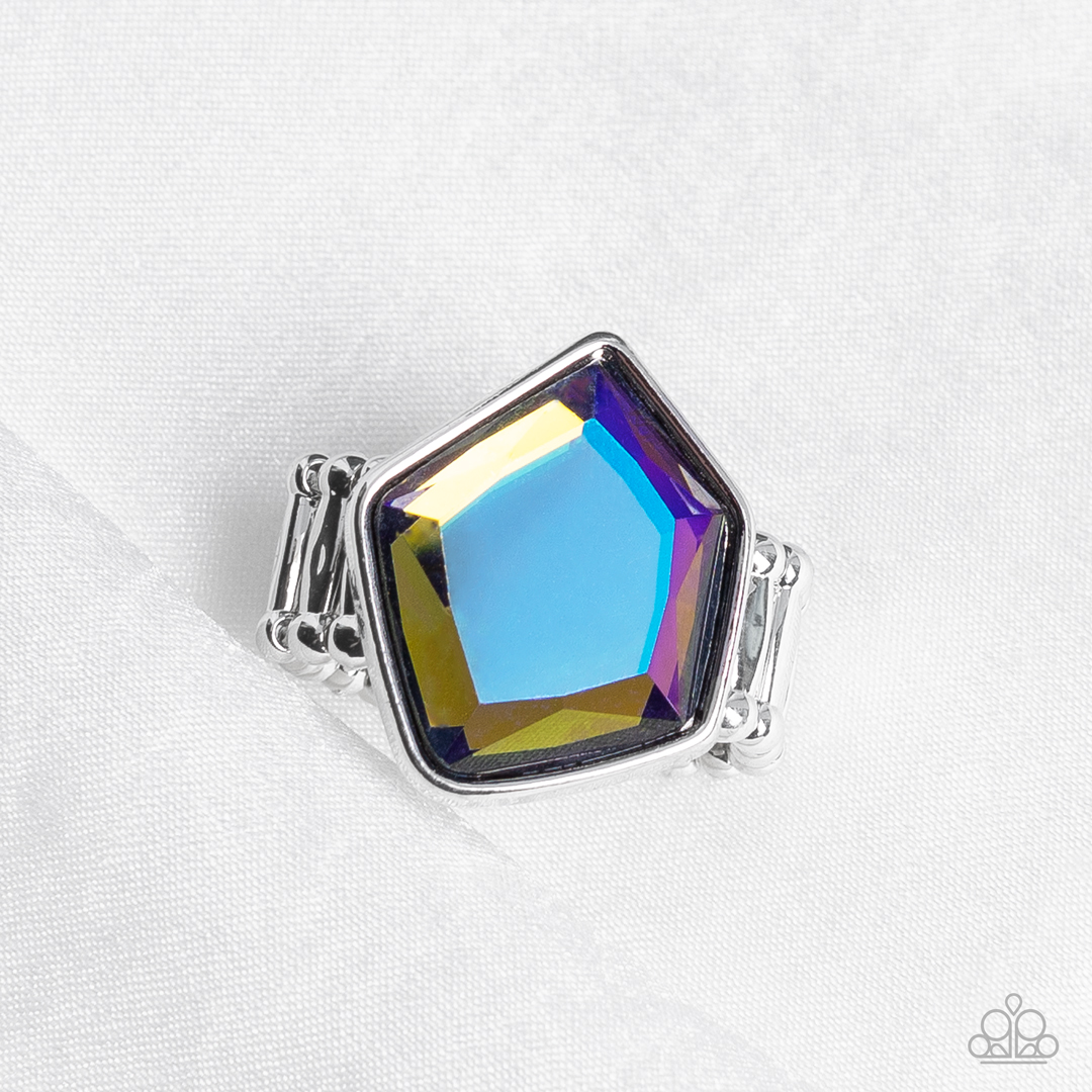 Featuring a purple UV finish, a faceted geometric multicolored gem sits asymmetrically atop the finger for a stellar finish. Features a stretchy band for a flexible fit.