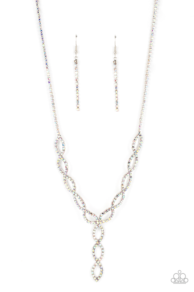 Strands of iridescent rhinestones delicately loop into interlocking infinities below the collar, drizzling into an icy extended pendant for a statement-making finish. Features an adjustable clasp closure.
