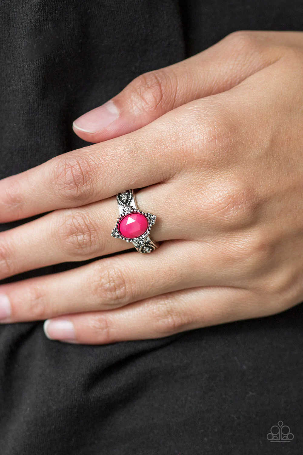 A faceted Pink Peacock bead is pressed into an ornate silver band radiating with silver studs and dainty white rhinestones for a refined look. Features a dainty stretchy band for a flexible fit.