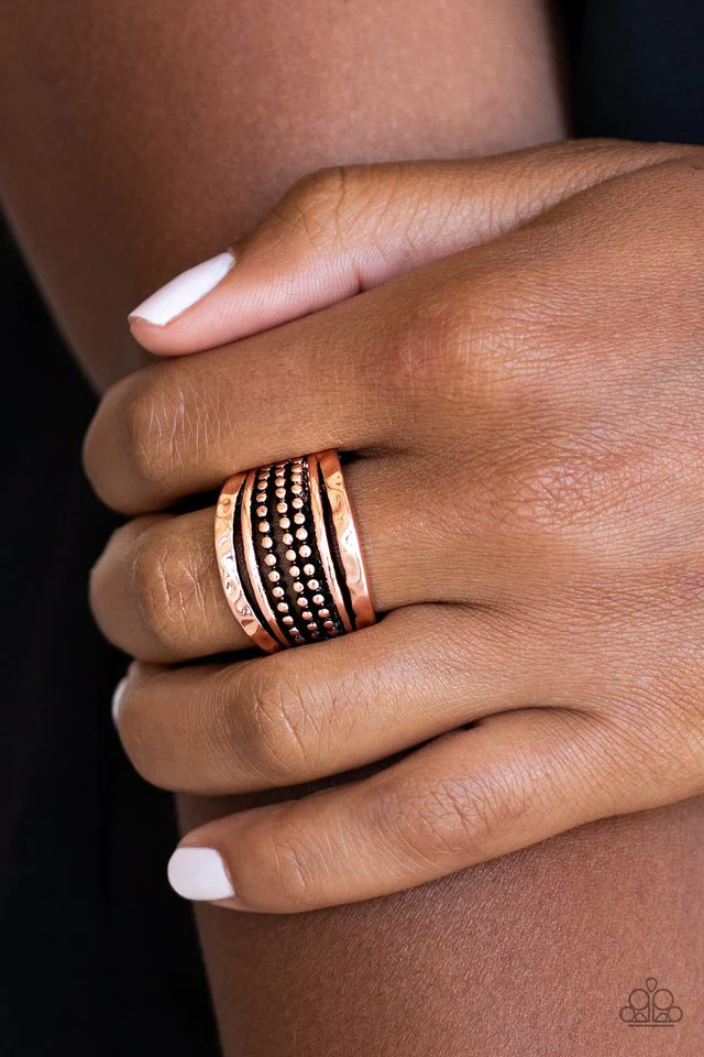 Delicately hammered in shimmering detail, two copper bands flank rows of smooth and dotted bands for a collision of glistening textures. Features a stretchy band for a flexible fit. Sold as one individual ring.