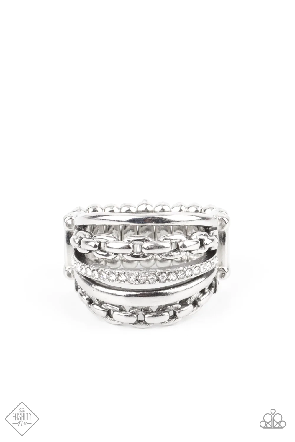 Infused with a dainty band of glassy white rhinestones, antiqued silver bands and layers of mismatched silver chains layer across the finger in a bold finish. Features a stretchy band for a flexible fit.