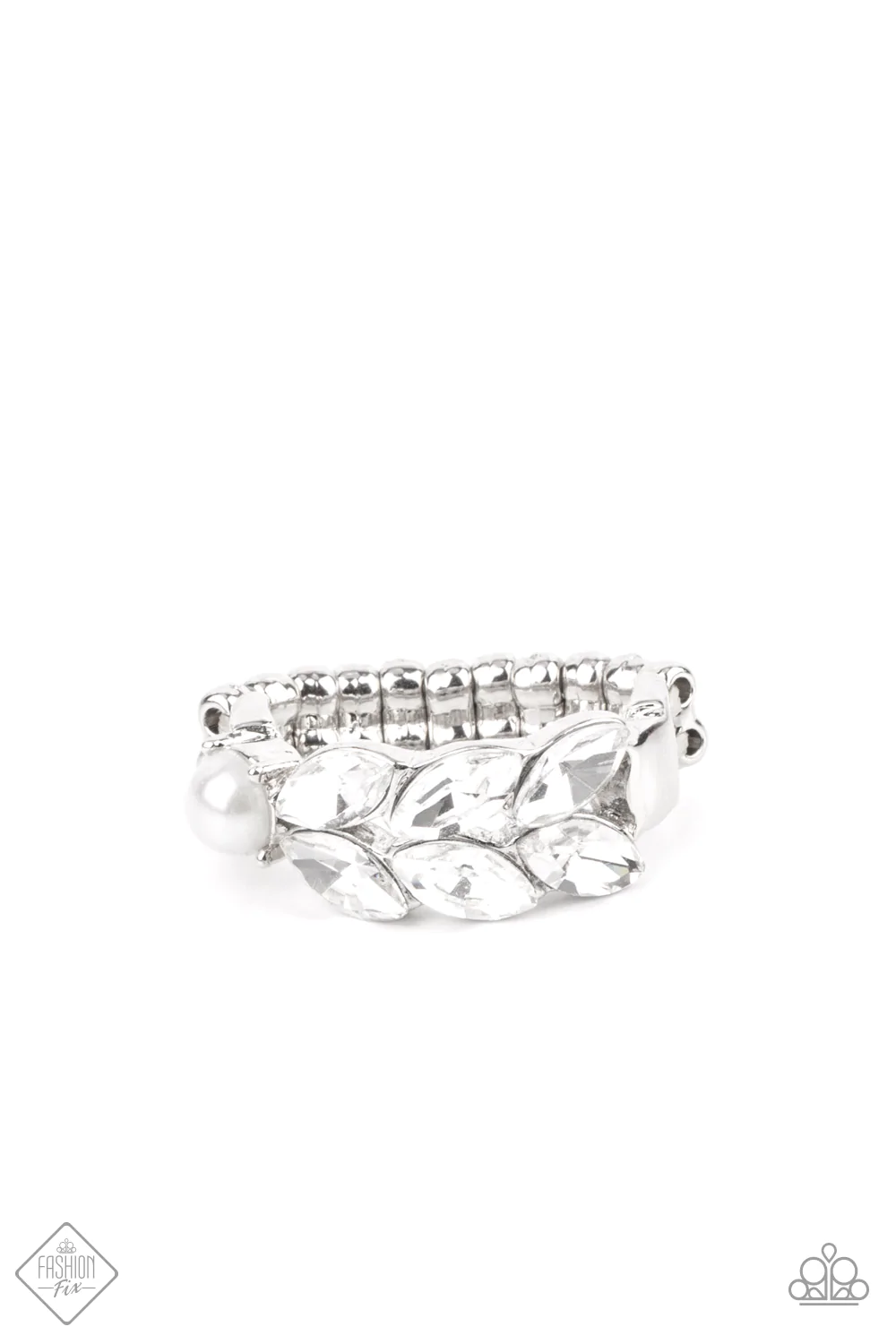 Pairs of glittery white marquise style rhinestones fan out behind a solitaire white pearl, coalescing into a timeless centerpiece atop the finger. Features a dainty stretchy band for a flexible fit.