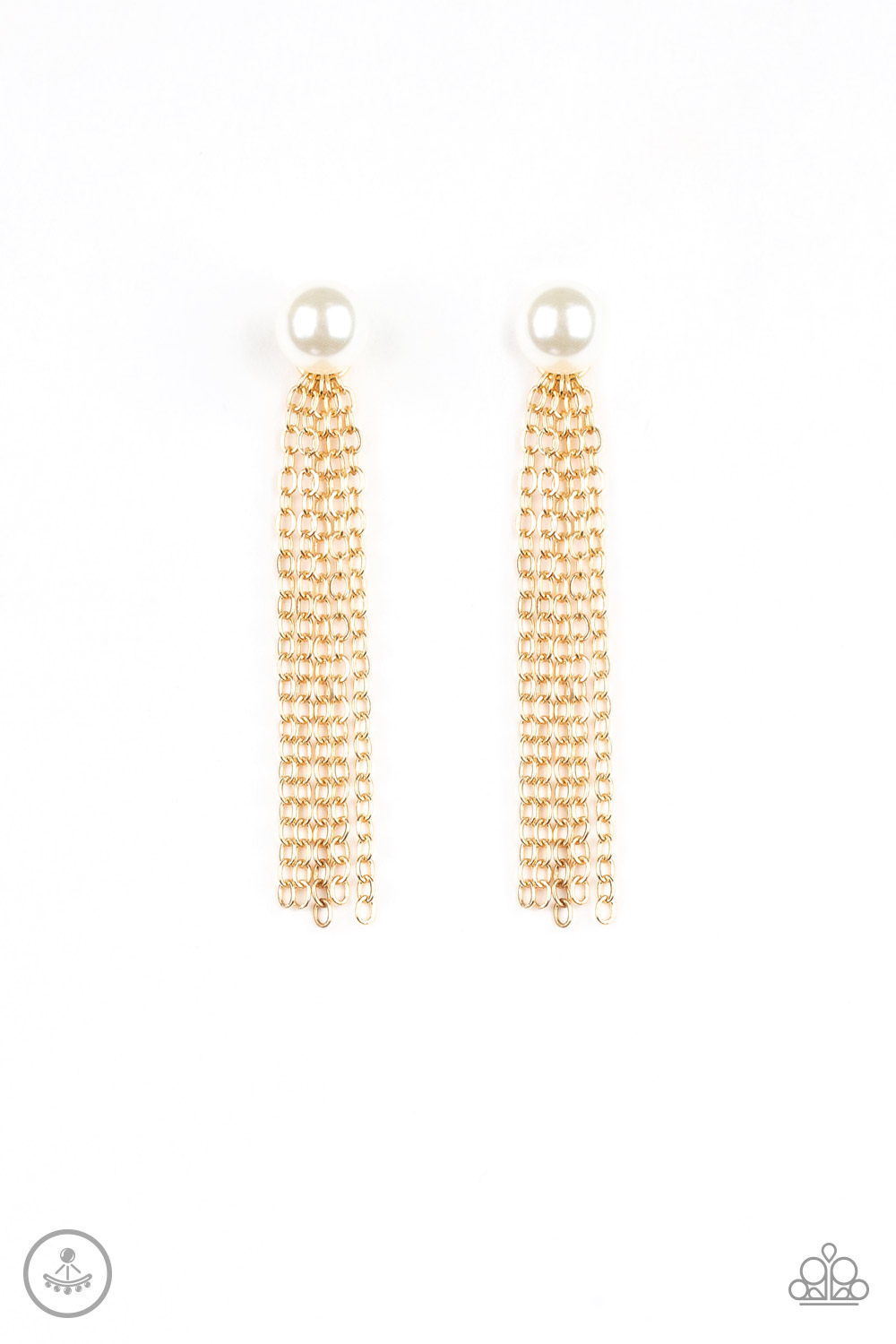 A solitaire white pearl attaches to a double-sided post, designed to fasten behind the ear. Brushed in a high-sheen shimmer, glistening gold chains peek out beneath the ear for a bold tasseled look. Earring attaches to a standard post fitting.