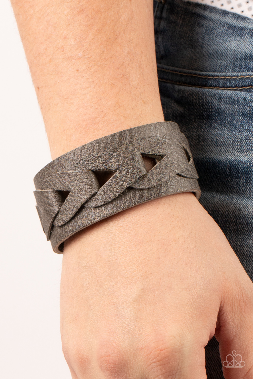 Featuring airy triangular cutouts, gray leather links interlock across the center of a distressed gray leather band for a rustic flair. Features an adjustable snap closure.