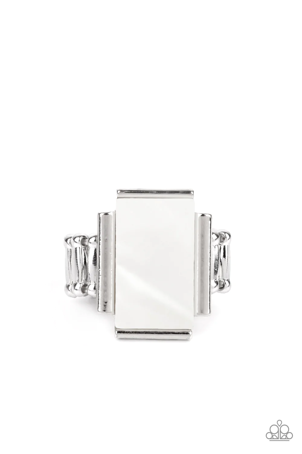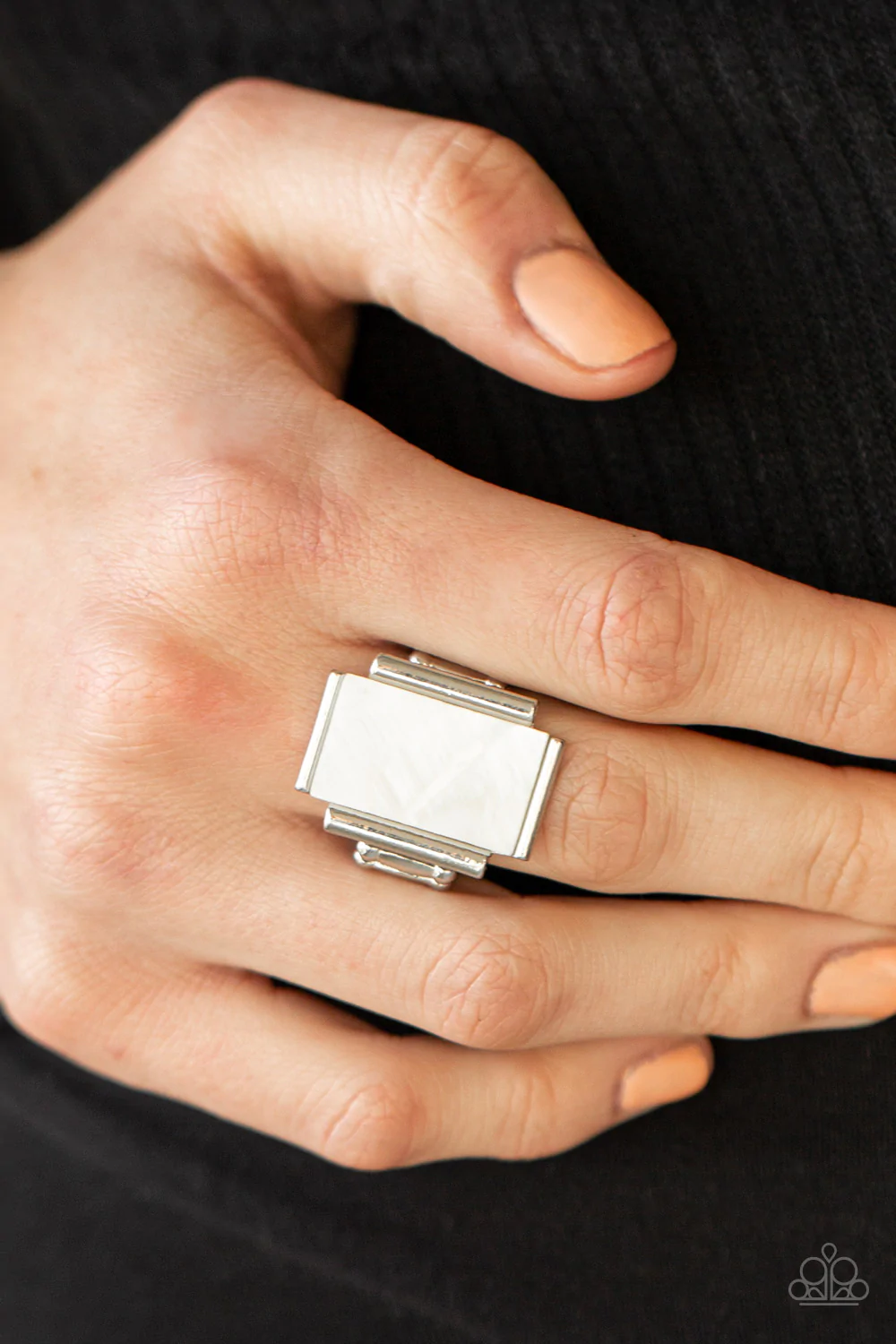 Featuring an iridescent shimmer, a white shell-like rectangle is nestled between silver bar-like fittings atop the finger for a mystical look. Features a stretchy band for a flexible fit.