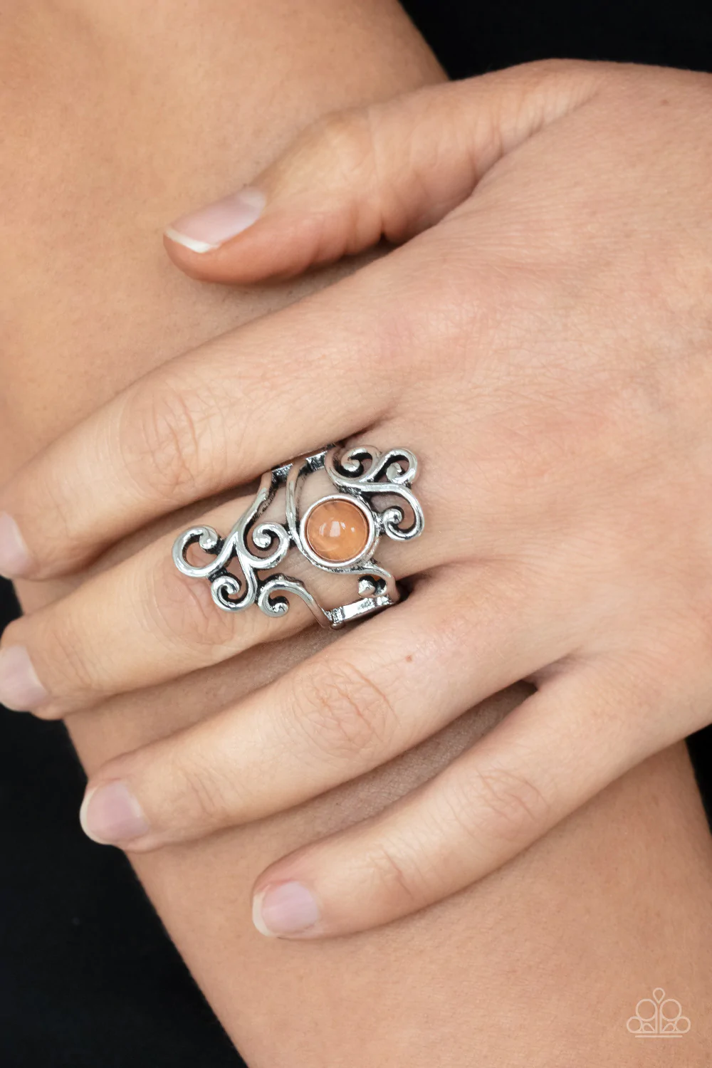 Rustic silver filigree vines around a glowing Marigold cat's eye stone, creating a whimsically asymmetrical display across the finger. Features a stretchy band for a flexible fit.
