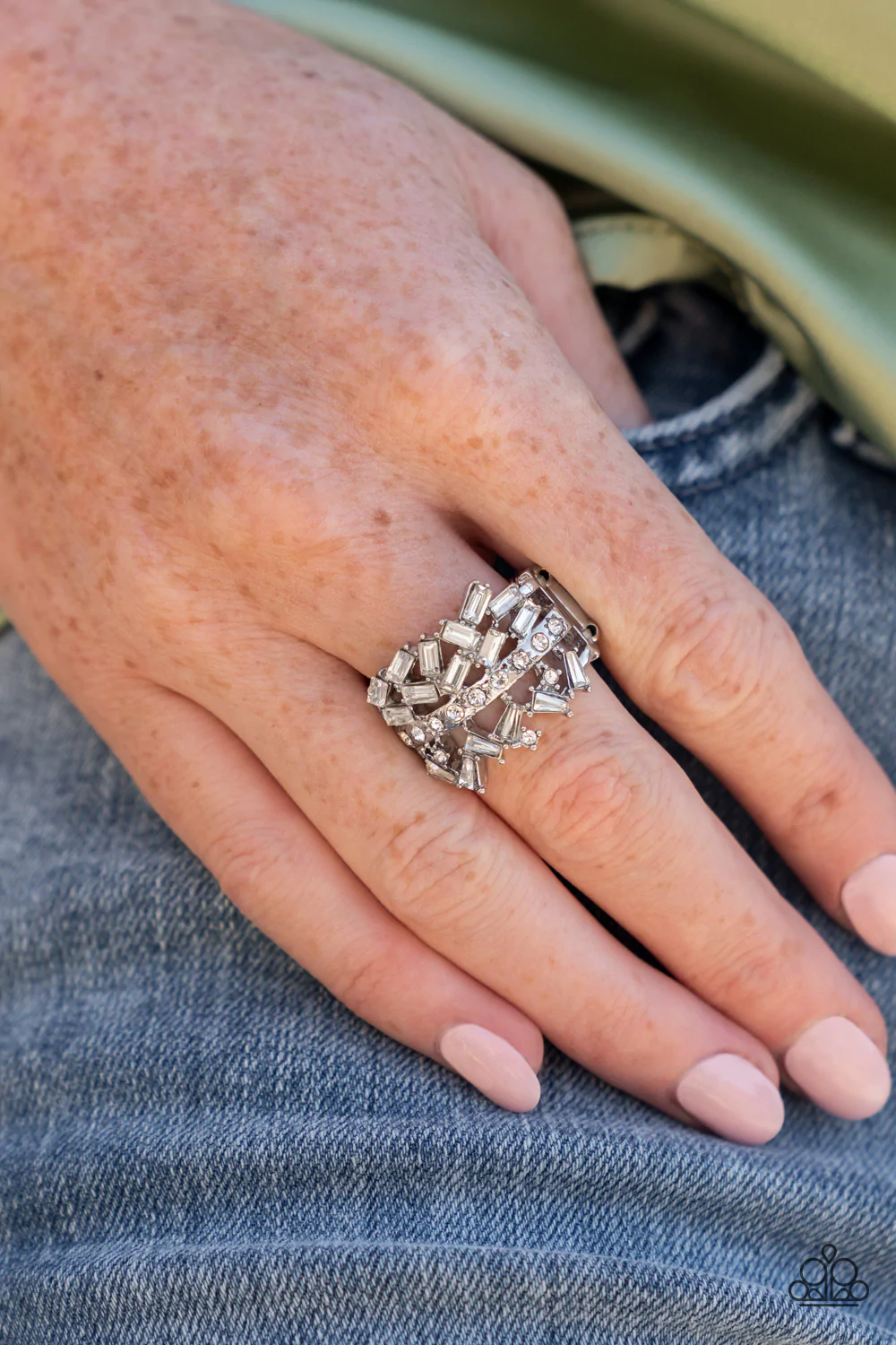 Dotted in dainty white rhinestones, a single silver band separates a haphazard explosion of round and emerald cut rhinestones across the finger. Features a stretchy band for a flexible fit.