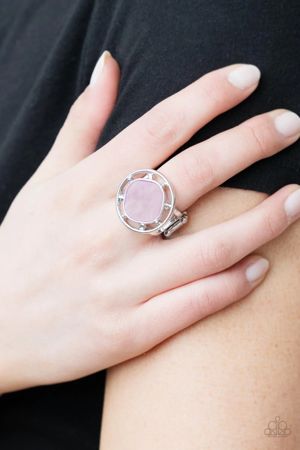 A pearly purple square bead, featuring rounded edges, is encircled with an airy silver compass-like frame creating a shimmering centerpiece atop the finger. Features a stretchy band for a flexible fit.