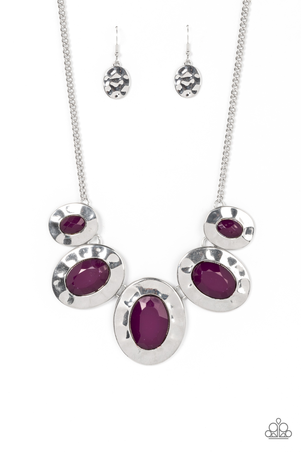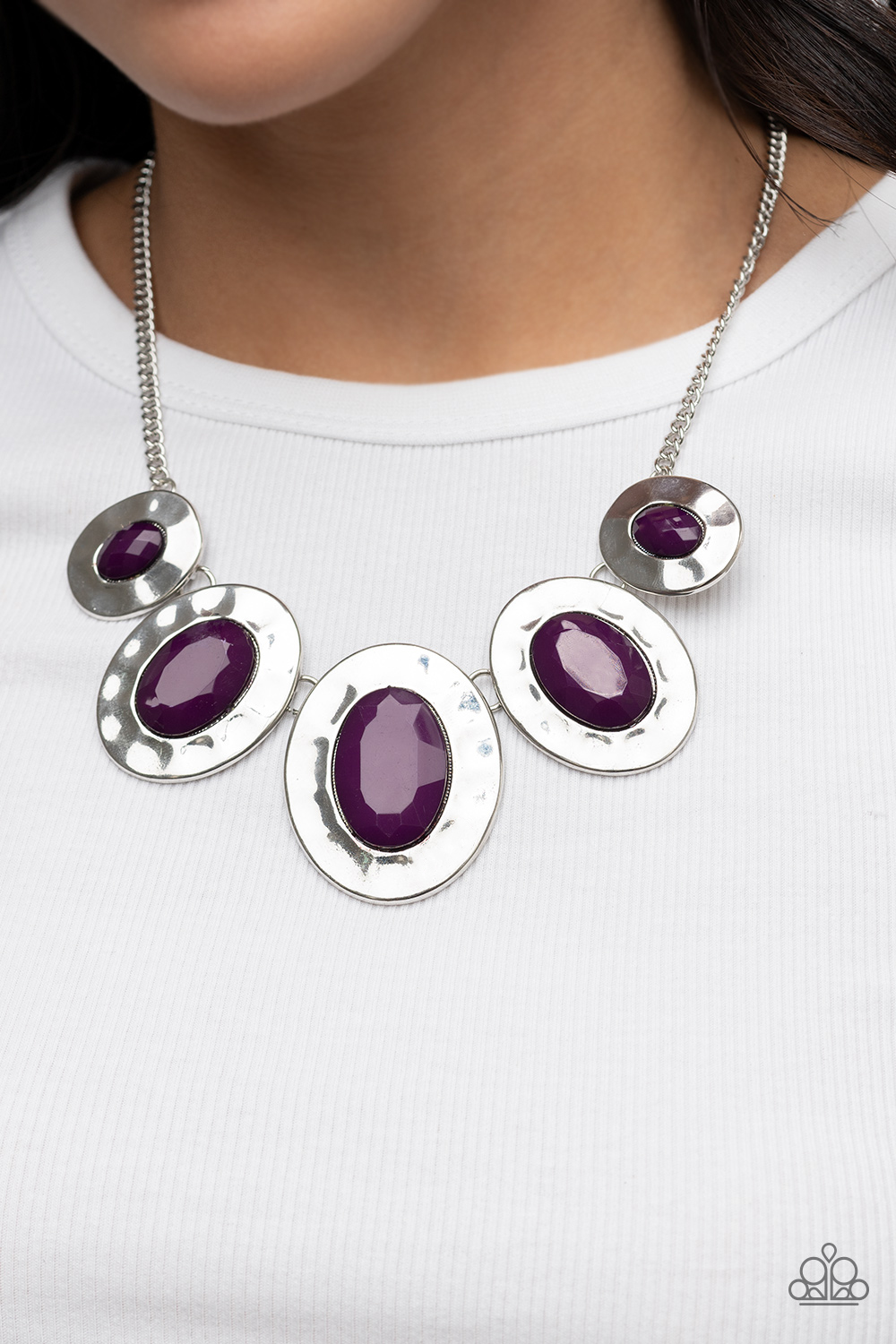 Gradually increasing in size, hammered silver oval frames are dotted with faceted plum beads as they delicately link below the collar for a vivacious pop of color. Features an adjustable clasp closure.