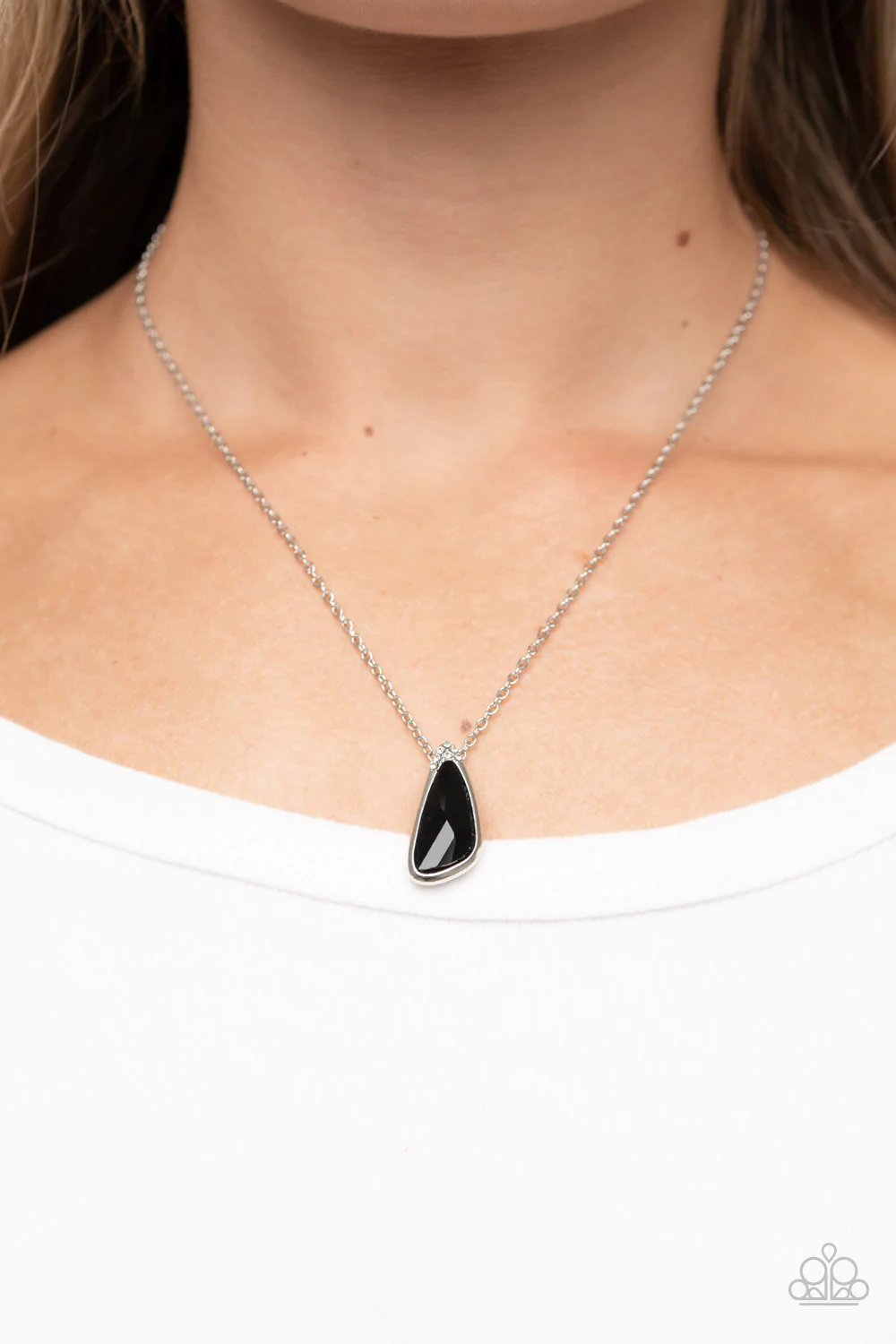 An asymmetrical black gem is pressed into a shiny silver frame dusted in glassy white rhinestones, resulting in a refined pendant at the bottom of a dainty silver chain. Features an adjustable clasp closure.