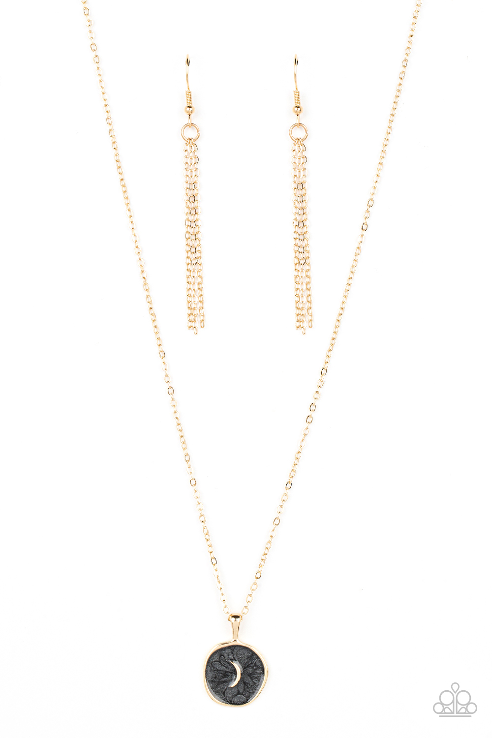 Painted in a shimmery black lacquer finish, an asymmetrical gold disc is dotted in a dainty gold moon accent as it swings from the bottom of a dainty gold chain below the collar for an enchanting finish. Features an adjustable clasp closure.