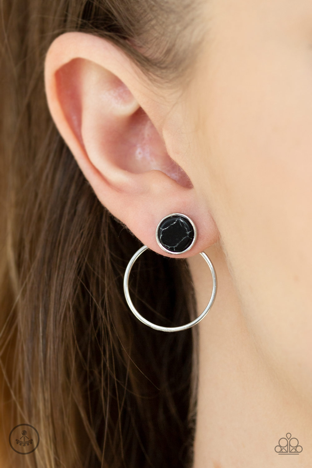Brushed in a faux marble finish, a dainty stone frame attaches to a double-sided post, designed to fasten behind the ear. A shiny silver hoop peeks out beneath the ear for a retro finish. Earring attaches to a standard post fitting.