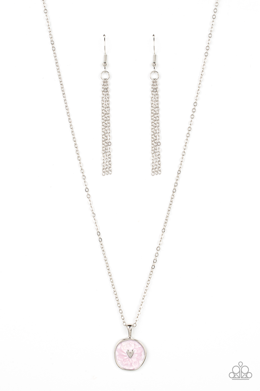 Painted in a shimmery pink lacquer finish, an asymmetrical silver disc is dotted in a dainty silver heart accent as it swings from the bottom of a dainty silver chain below the collar for a charming finish. Features an adjustable clasp closure.