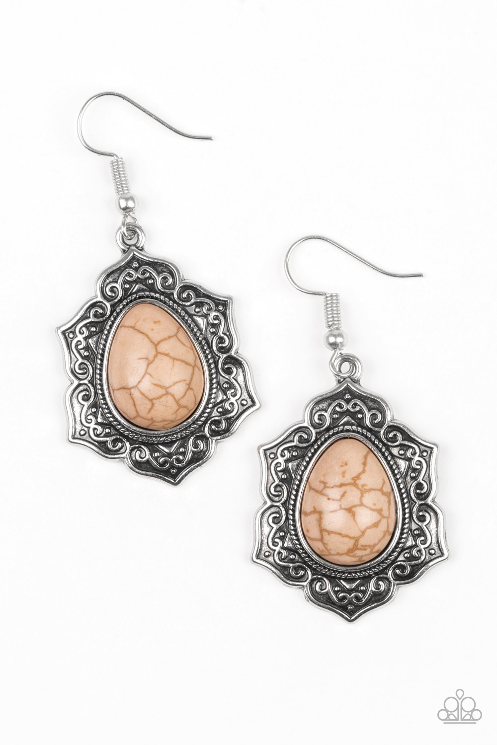 Decorative silver petals spin around an earthy brown stone center for a seasonal look. Earring attaches to standard fishhook fitting.
