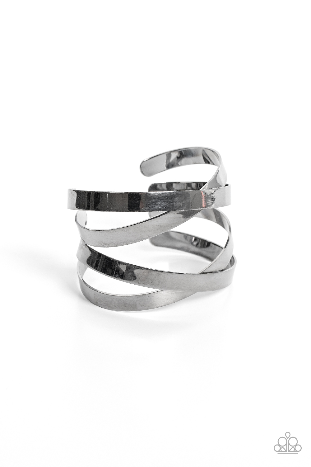 Brushed in a high-sheen finish, two sets of flat gunmetal bands crisscross over the wrist as they wrap into a lustrous cuff giving off an industrial vibe.