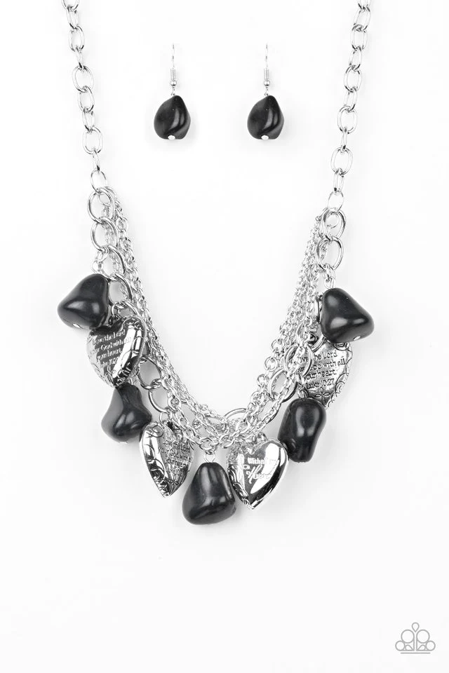 Black faux rocks alternate with heart charms along a chunky silver chain. Hearts are inscribed with the phrase "With All My Heart" on one side and a short bible verse on the other that reads, "Love the Lord thy God with all your heart. Luke 10:27." Layers of various chains add some edge. Features an adjustable clasp closure. Sold as one individual necklace. Includes one pair of matching earrings.