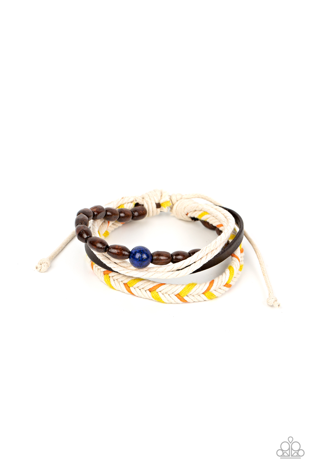 Featuring a glassy blue centerpiece, a wooden beaded bracelet layers with leather, natural cords, and a braided corded band around the wrist for an adventurous vibe. Features an adjustable sliding knot closure.