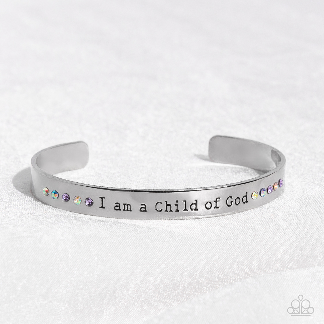A shiny silver cuff stamped with the phrase "I am a Child of God" encircles the wrist. Dainty sapphire, violet and iridescent rhinestones shimmer at the borders of the phrase for a whimsical finish. Due to its prismatic palette, color may vary.