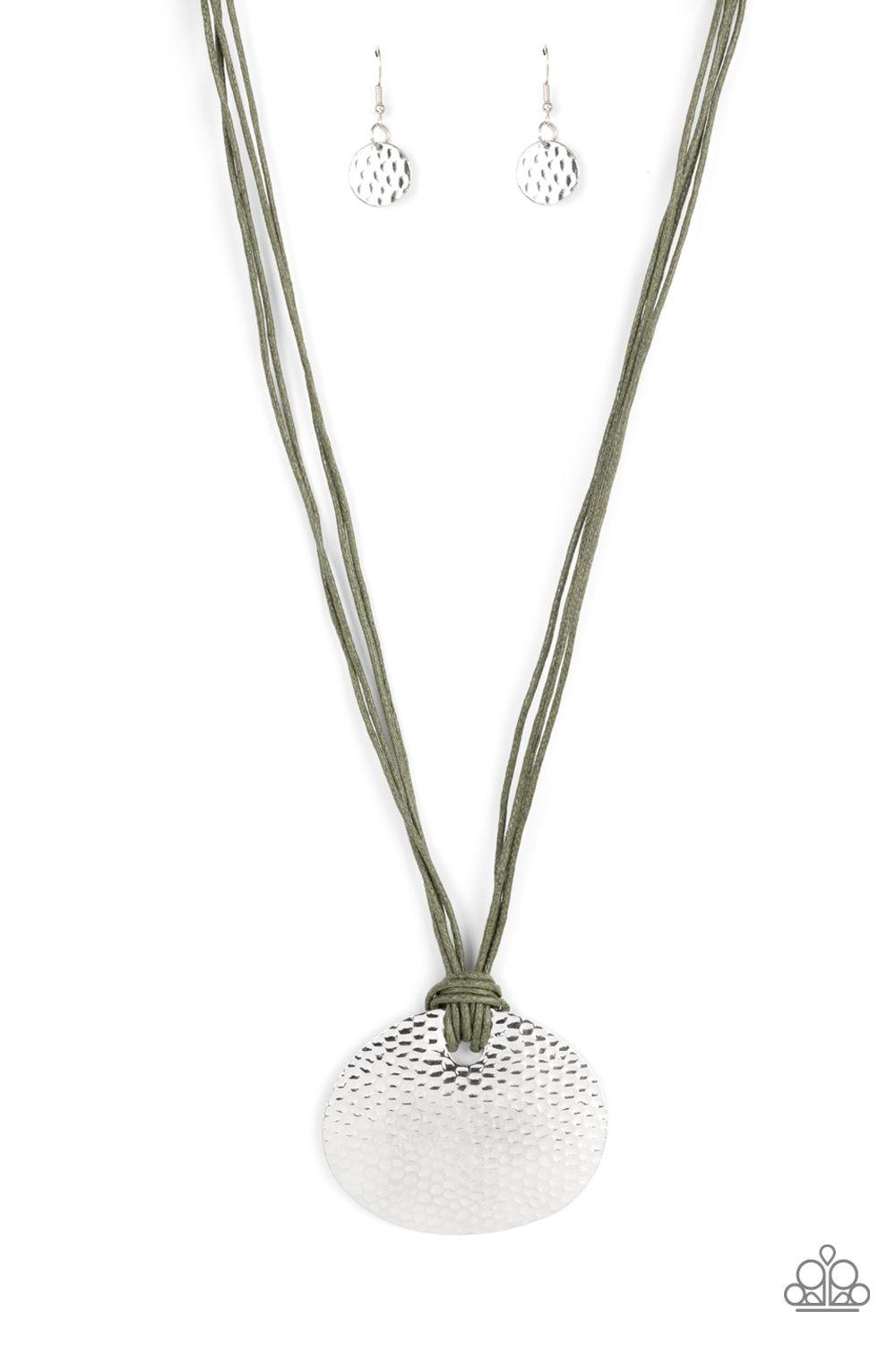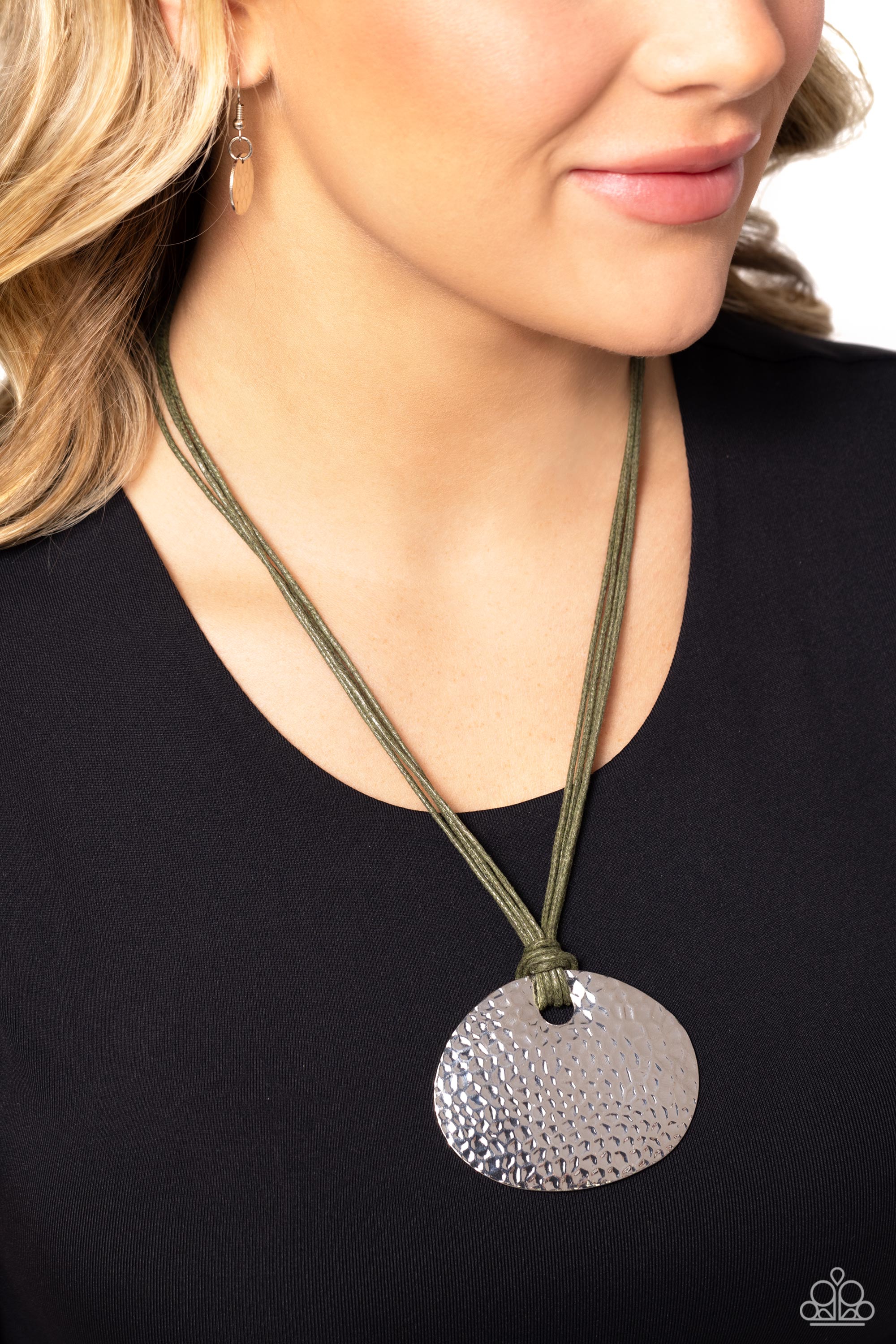 A meticulously hammered silver frame is knotted in place with Olive Branch cording, invoking an artisan inspired aesthetic. Features an adjustable clasp closure.