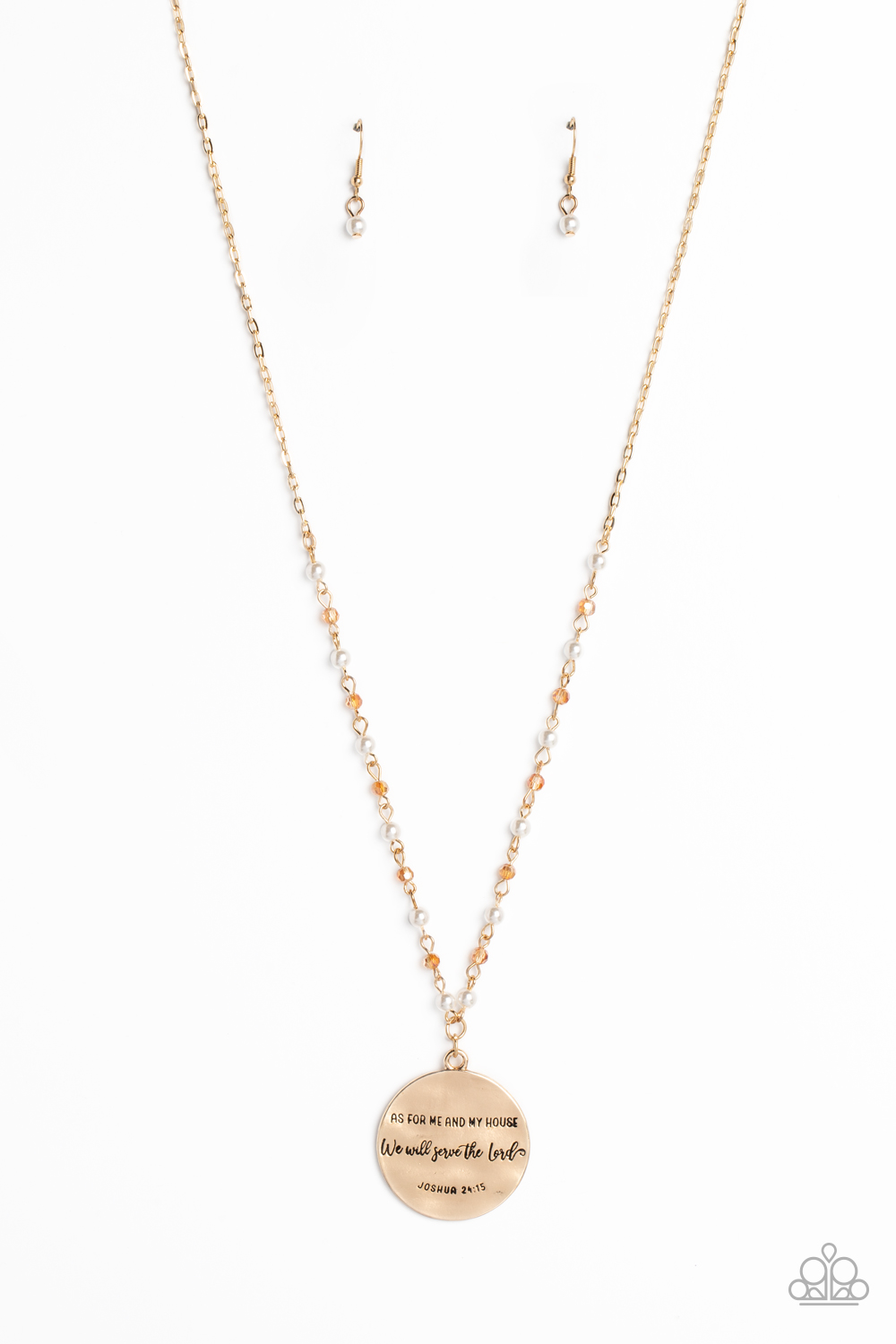 Infused with glassy beads brushed in a gold undertone, and bubbly white pearls, an extended, dainty gold chain shimmers and shines down the chest. Hanging from the bottom of the light-reflecting chain, an oversized gold disc, hammered with vintage detailing features the stamped phrase "As for me and my house we will serve the Lord" with the scripture reference "Joshua 24:15" listed below for an inspirational finish. Features an adjustable clasp closure.
