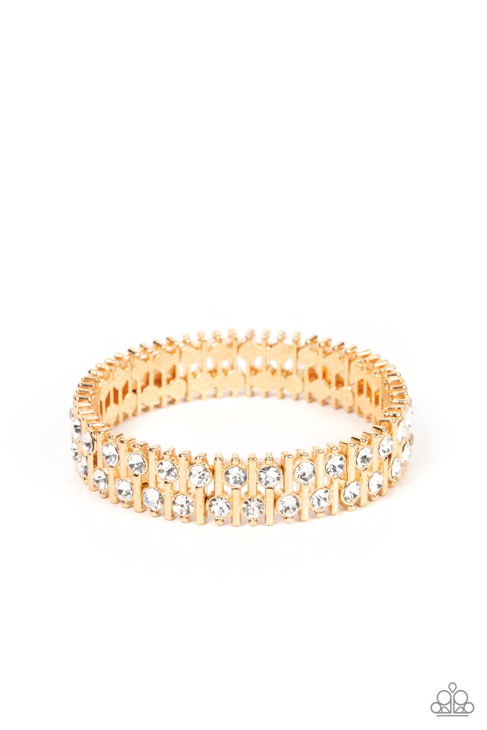 Attached to gold bars, a staggered display of solitaire white rhinestones alternates along a stretchy band around the wrist for an unexpected pop of shimmer around the wrist.