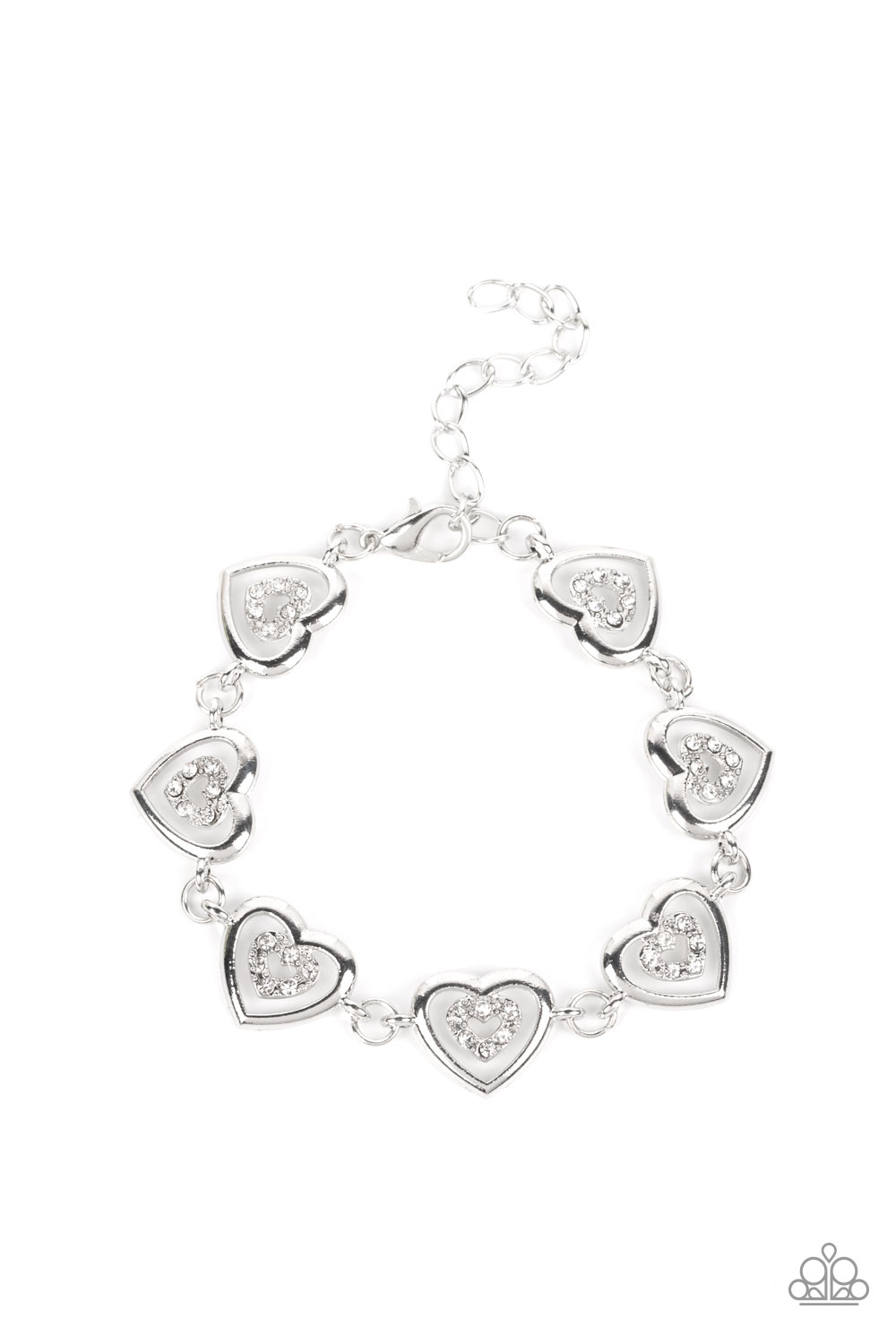 Dotted with dainty white rhinestones, airy silver heart silhouettes are affixed to the points of larger silver heart frames. The two dimensional heart frames link together around the wrist in a flirtatious finish. Features an adjustable clasp closure.