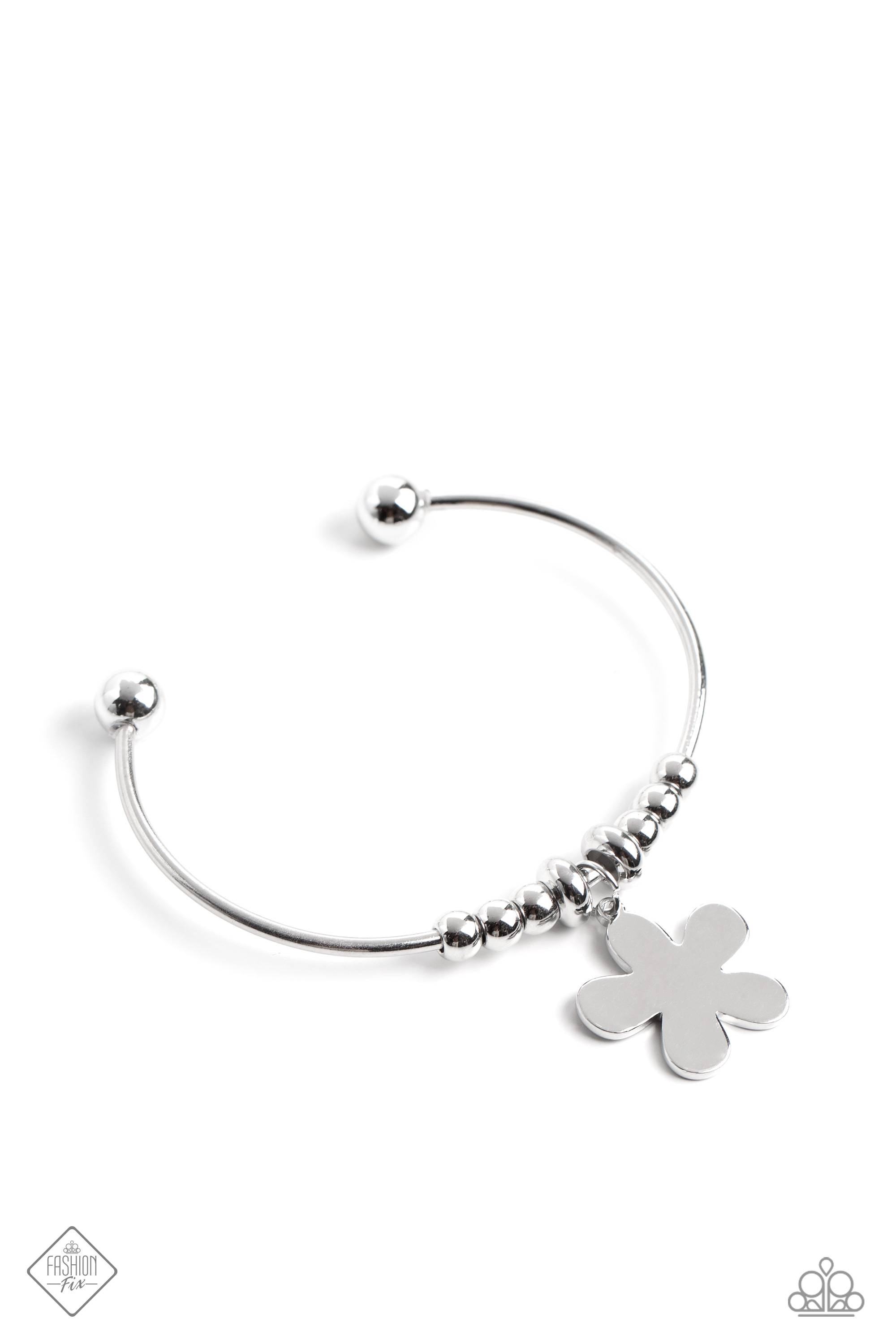 A skinny silver bar is capped in barbell fittings, allowing a collection of sleek silver beads and a psychedelic flower in a high-sheen finish to slide along its surface as it arcs across the wrist.