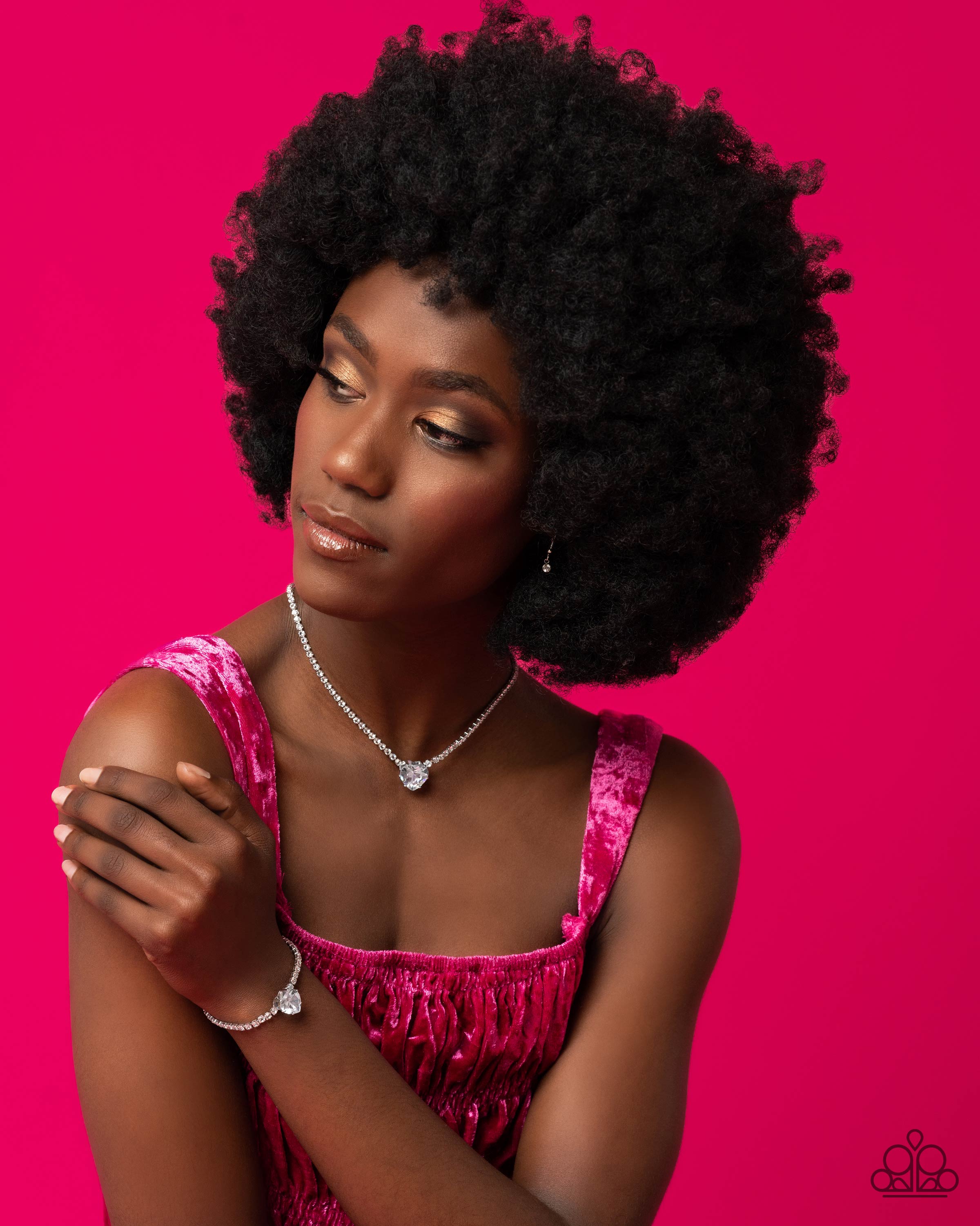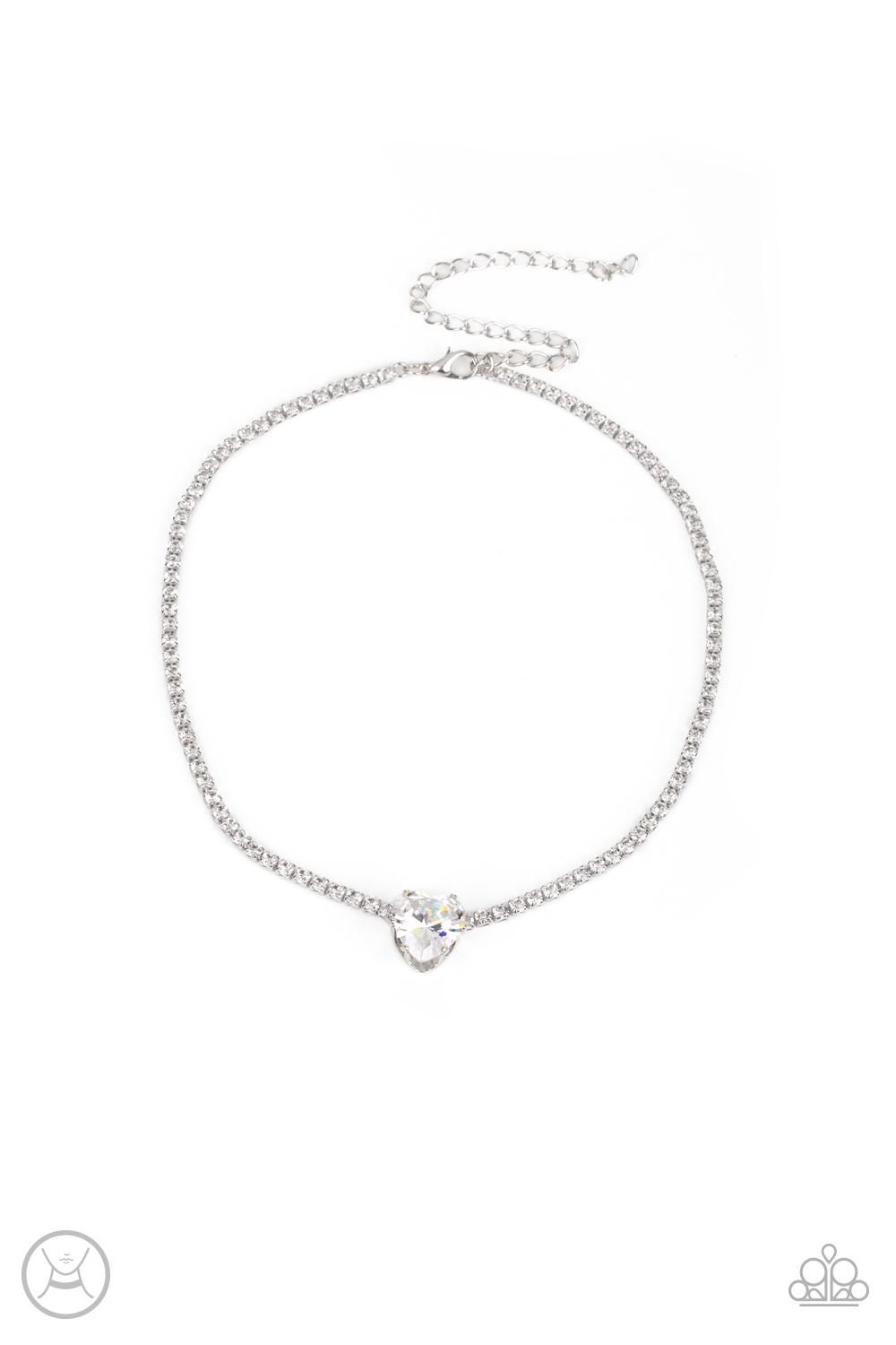 An oversized white heart-shaped gem, set in an airy, pronged silver fitting, glitters at the center of a blinding row of dainty, glassy white rhinestones set in square silver fittings, resulting in a flirtatious sparkle around the neckline. Features an adjustable clasp closure.