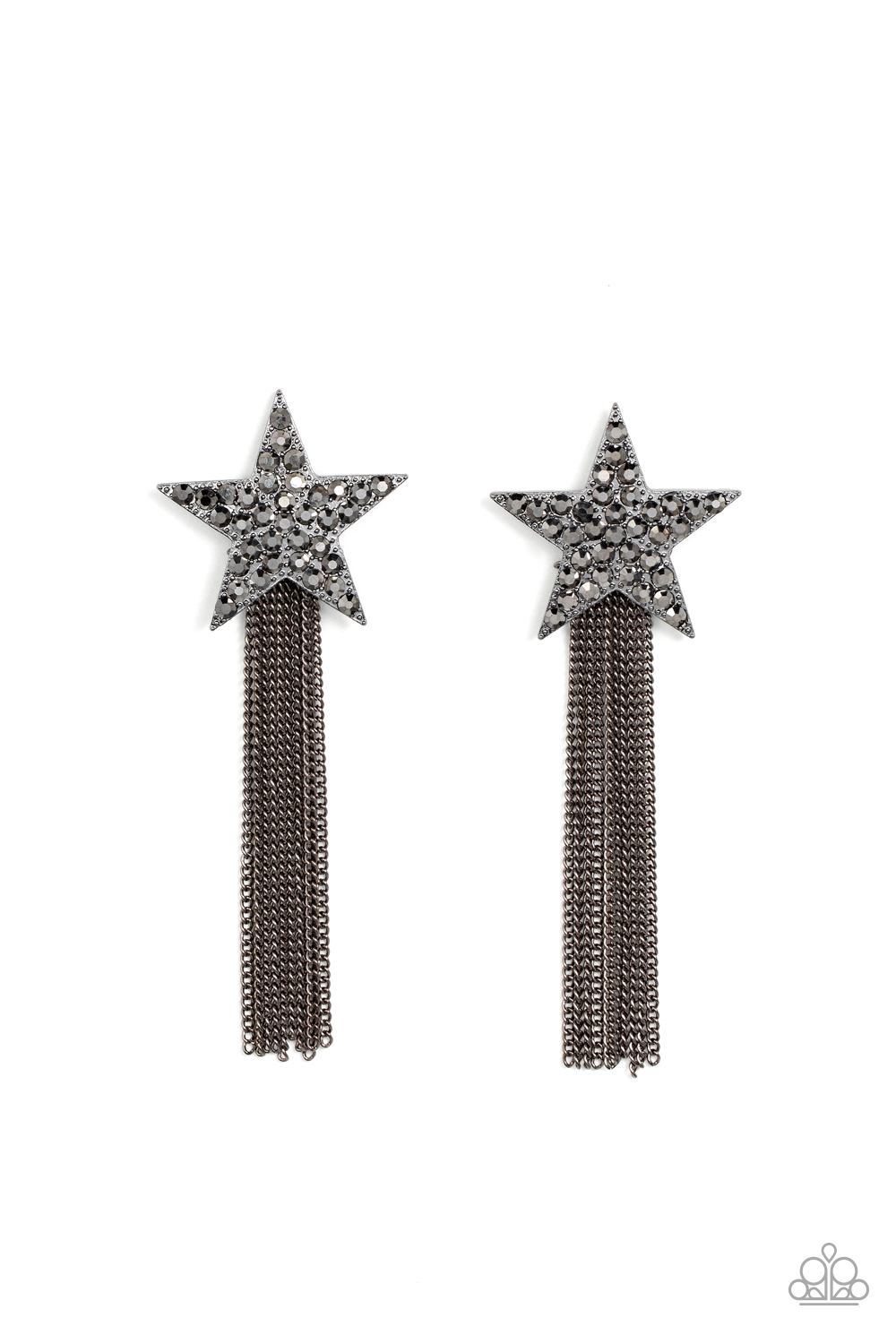 A curtain of gunmetal chains streams out from the bottom of an oversized gunmetal star encrusted in smoky hematite rhinestones, resulting in a stellar tassel. Earring attaches to a standard post fitting.