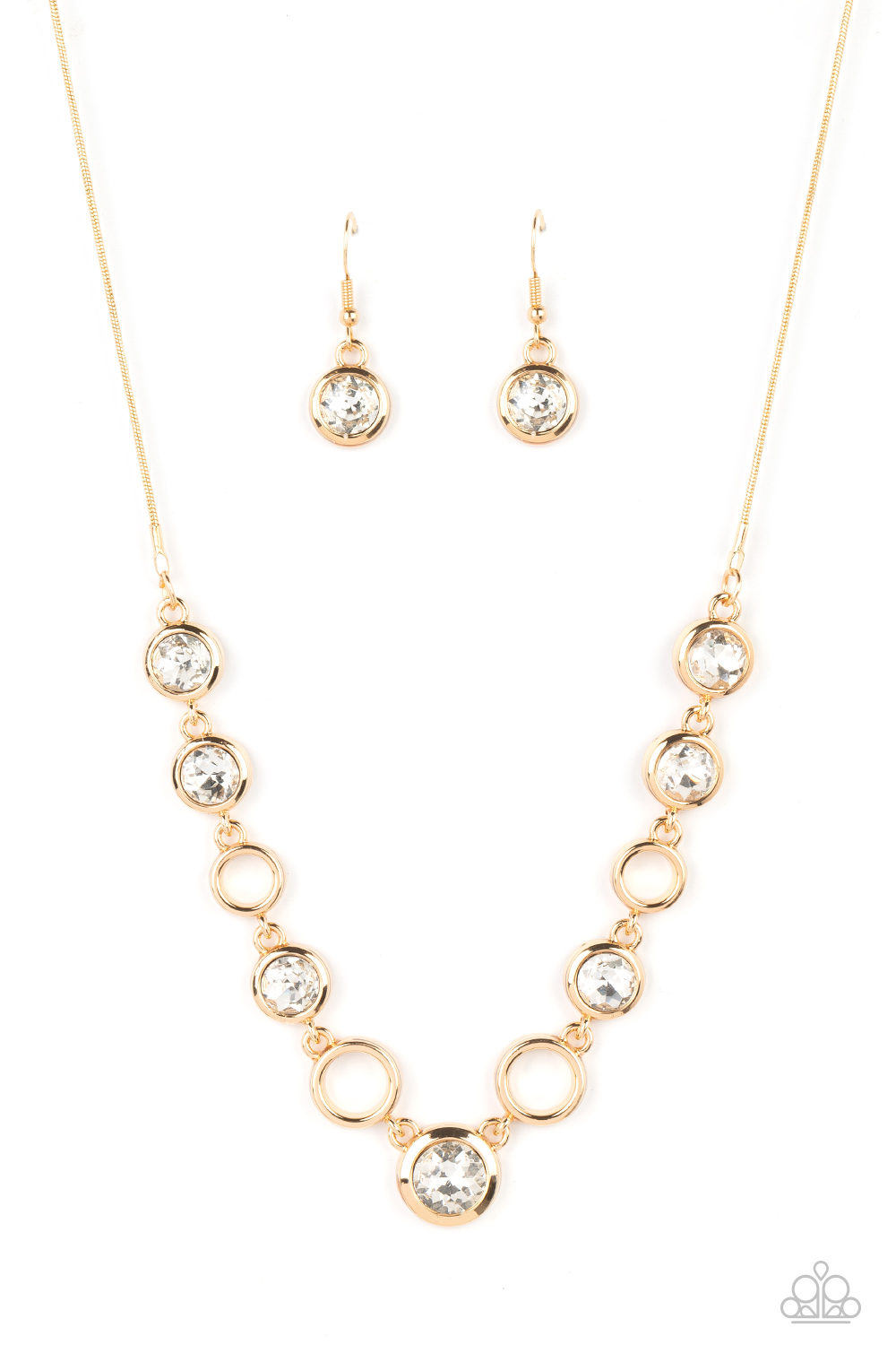 Thick airy gold hoops interlock with round brilliant-cut white rhinestones set in similar thick frames for an unmatched elegant sparkle. Features an adjustable clasp closure.