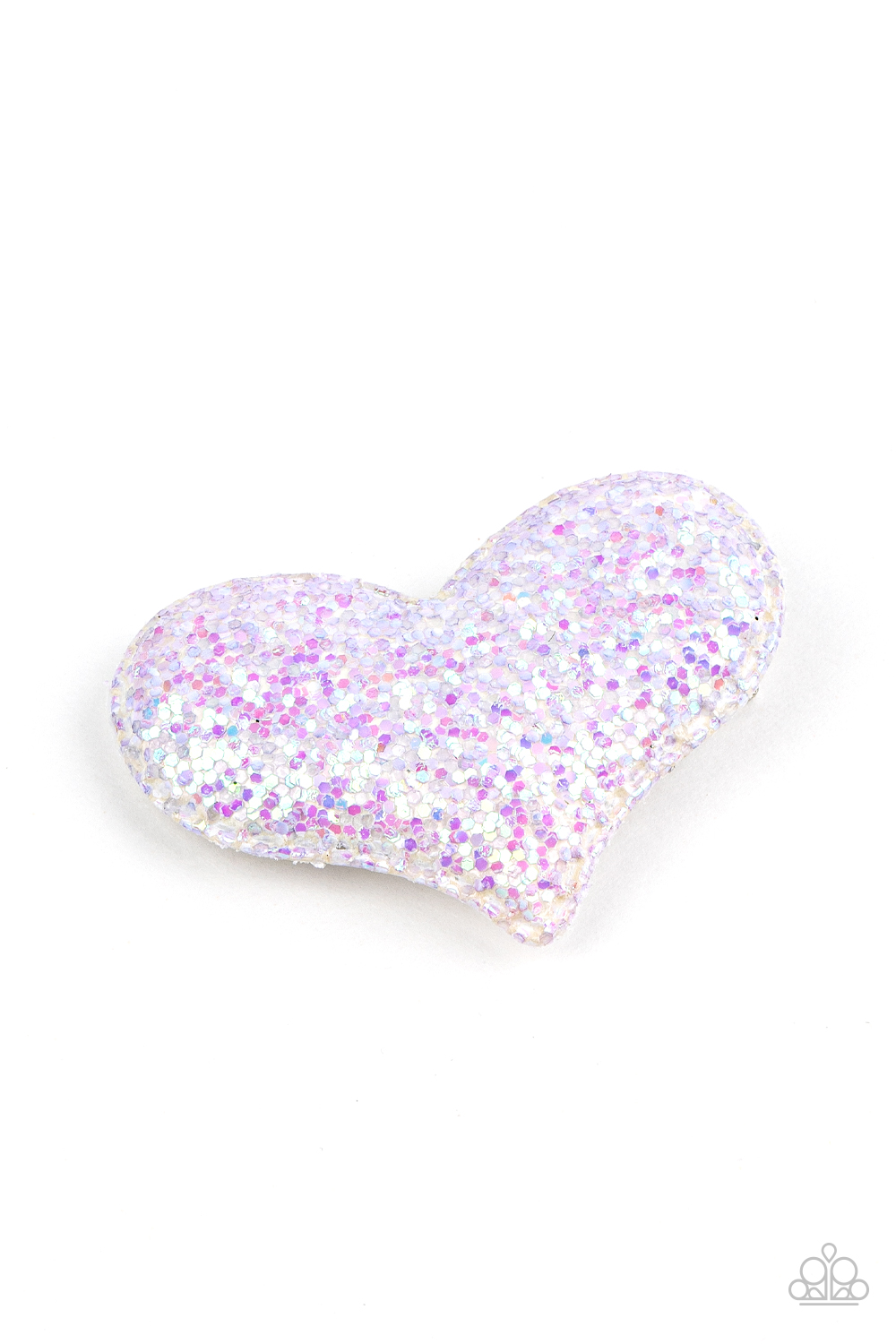 A puffy purple heart frame is dusted in iridescent sparkles, creating a flirtatious centerpiece. Features a standard hair clip on the back.