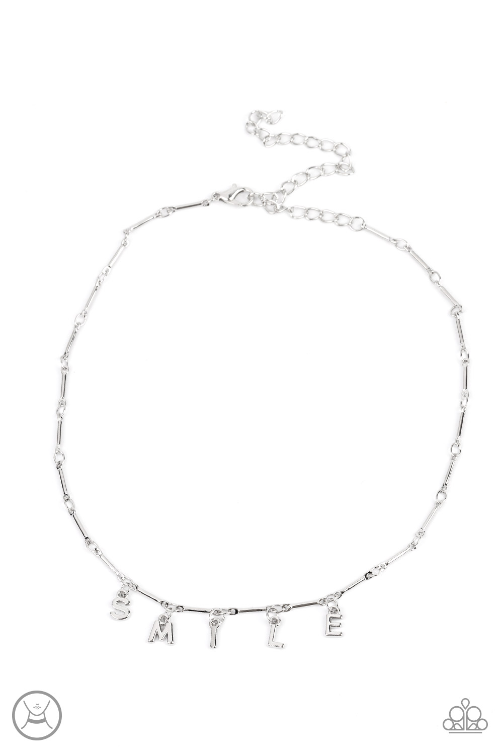 Separated by dainty silver rods, silver letters spell out the word SMILE in a soft, and simple manner. Features an adjustable clasp closure.